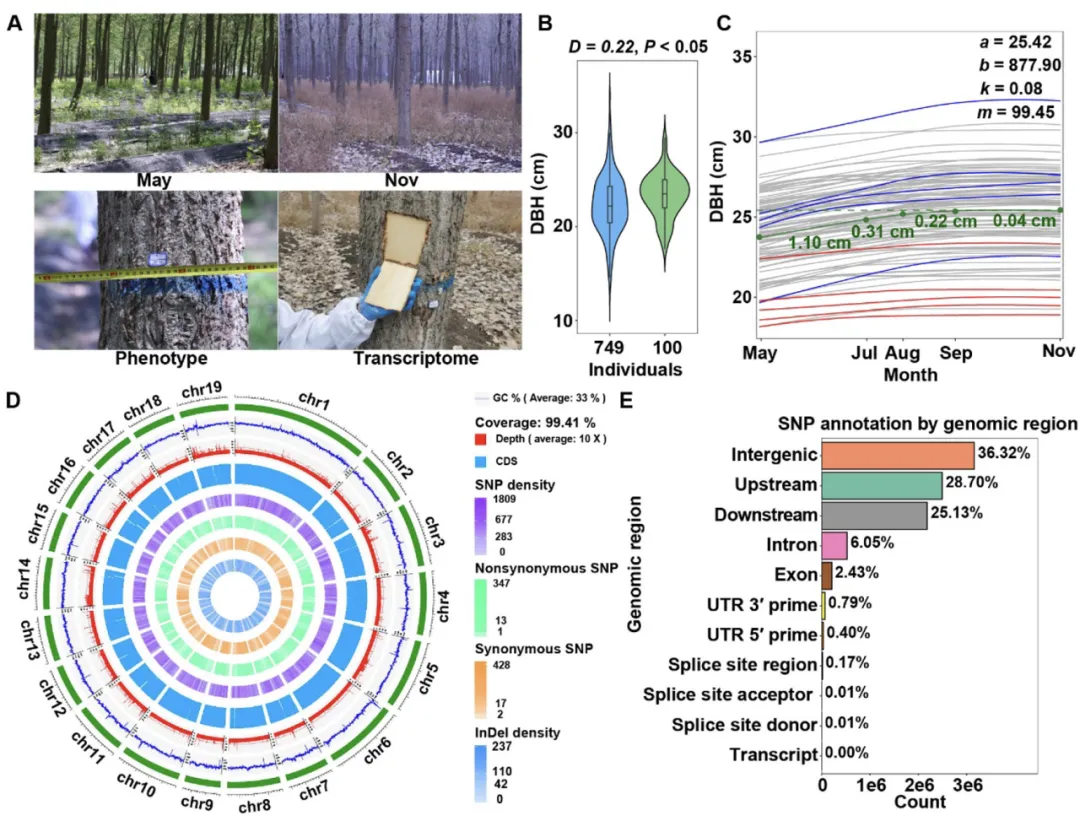 A:美洲黑杨(Populus deltoides)全同胞群体的田间照片;B:749株个体在单个时间点测量的胸径(DBH)分布;C:树木随时间的生长轨迹;D:基于重测序数据的全基因组遗传变异分布(由外向内依次为基因组大小、GC含量、测序覆盖度、SNP密度、非同义SNP、同义SNP及Indel密度);E:SNP在基因组各功能区的分布情况。