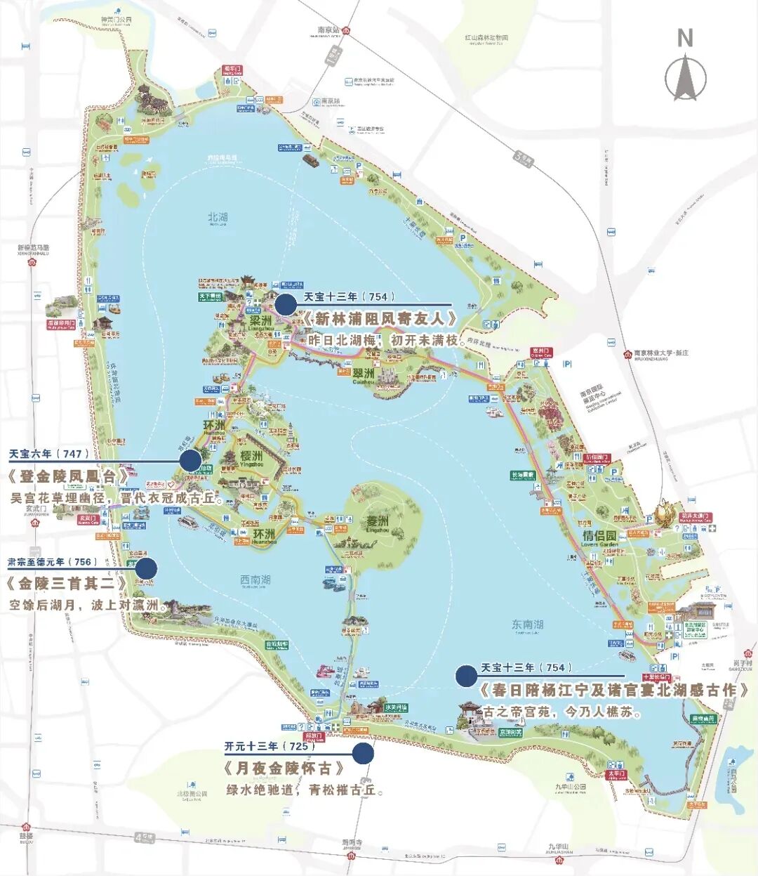 虽然已时隔千年,但其屐痕依然有迹可寻。他与杨利物一行登舟的地点在今日玄武湖解放门一带,泛舟在今日与台城相连的湖面上。他来凭吊的郭璞墩在距离玄武门不足200米的环洲上。虽然其赏月和寻梅的的具体地点已难以考证,当然这也无须考证,因为诗在,景就在。