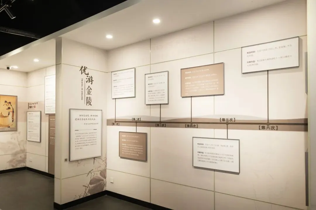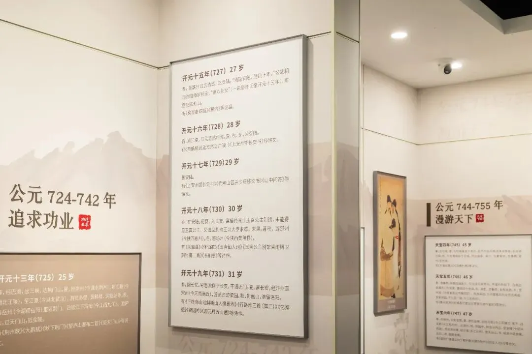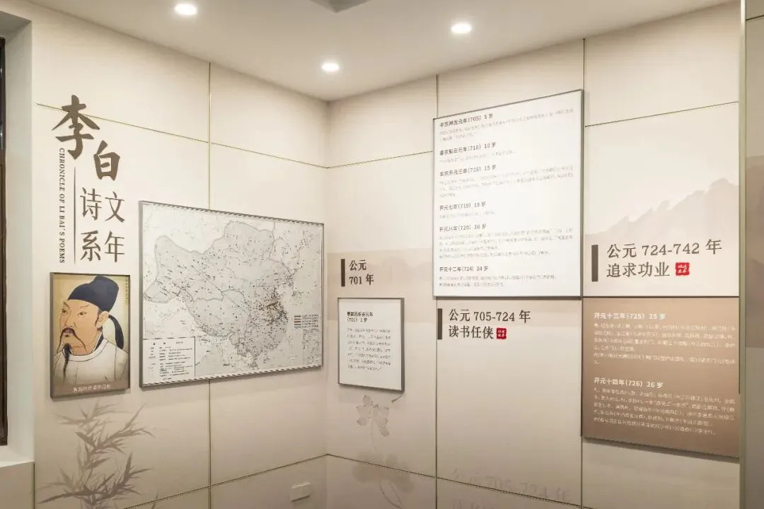 馆内精心设计了一条时间轴,清晰标注了李白每一次到访金陵的年份及在此期间留下的经典诗篇:第一次,开元十三年(725)秋,25岁的李白“仗剑去国,辞亲远游”,抵达金陵,次年春离开前往扬州,留下了《金陵城西楼月下吟》《长干行二首》等作品。“郎骑竹马来,绕床弄青梅。同居长干里,两小无嫌猜。”这流传千年的“青梅竹马”“两小无猜”意象,便诞生于李白第一次金陵之行。