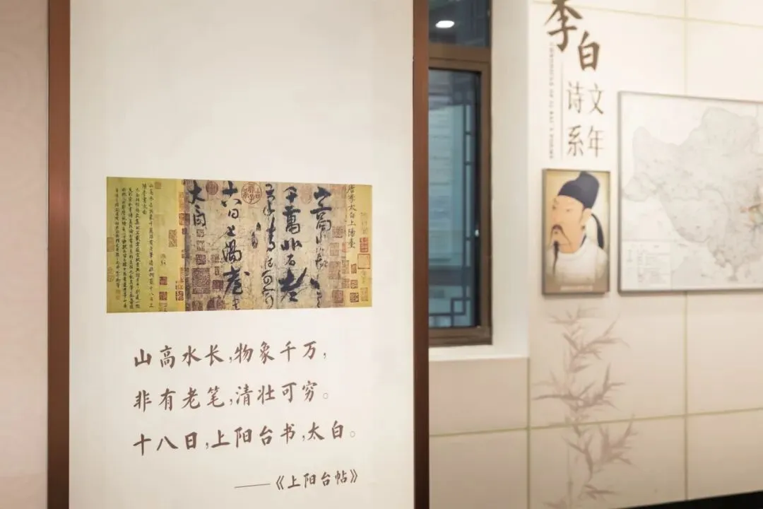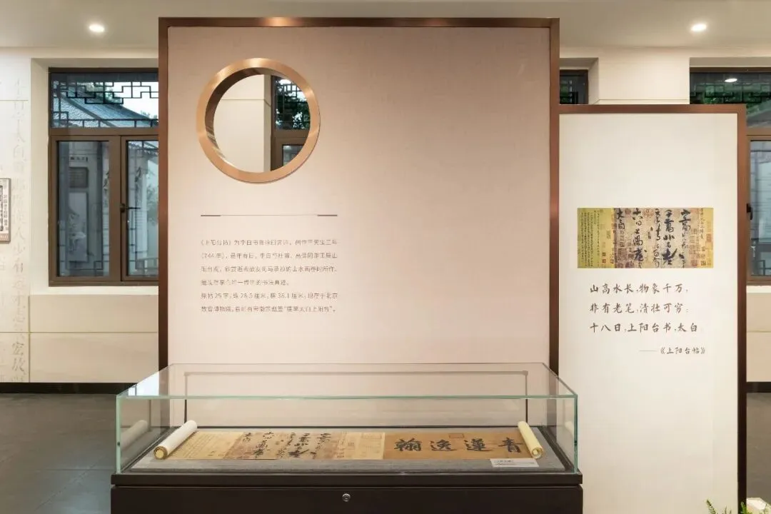 屏风背面,陈列着《上阳台帖》复制品——这是李白现存唯一传世的书法真迹。“山高水长,物象千万,非有老笔,清壮可穷。”寥寥数字,诗仙笔墨间的豪迈气度扑面而来。这份创作于唐天宝三年(744)的作品,见证了李白与杜甫、高适同游王屋山的雅集,如今在金陵诗仙馆中,成为连接古今的珍贵纽带。