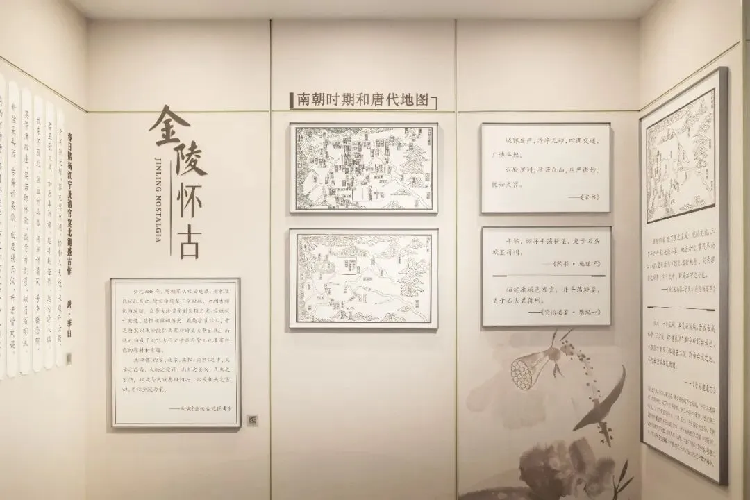 在金陵诗仙馆内,“金陵怀古”这一文学母题的源流被清晰地梳理出来。馆中并列展示着南朝、隋朝、唐朝三个时期的金陵城地图,直观地揭示了这座古城从“钟山龙盘,石城虎踞”的鼎盛繁华,到隋代以后渐趋沉寂的历史轨迹。