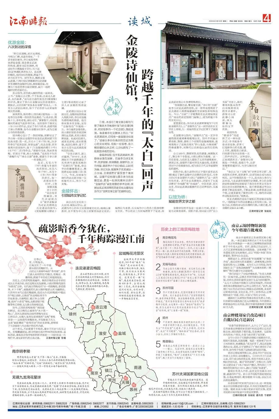 “昨日北湖梅,初开未满枝。今朝白门柳,夹道垂青丝。”一千多年前的寒冬,李白被风雪所困滞留金陵,惦念着玄武湖的梅香,踏雪寻踪至湖畔,将这份冬日雅趣凝于诗行,写下这首《新林浦阻风寄友人》。玄武湖的梅花,也因诗仙的笔墨,跨越千年岁月流芳至今。时至冬日,梅香又漫玄武湖,江南时报记者循着诗仙足迹漫步至湖畔的金陵诗仙馆,寒枝凝香处,仿佛与千年前的李白隔空相望,展开一场跨越时空的诗意对话。