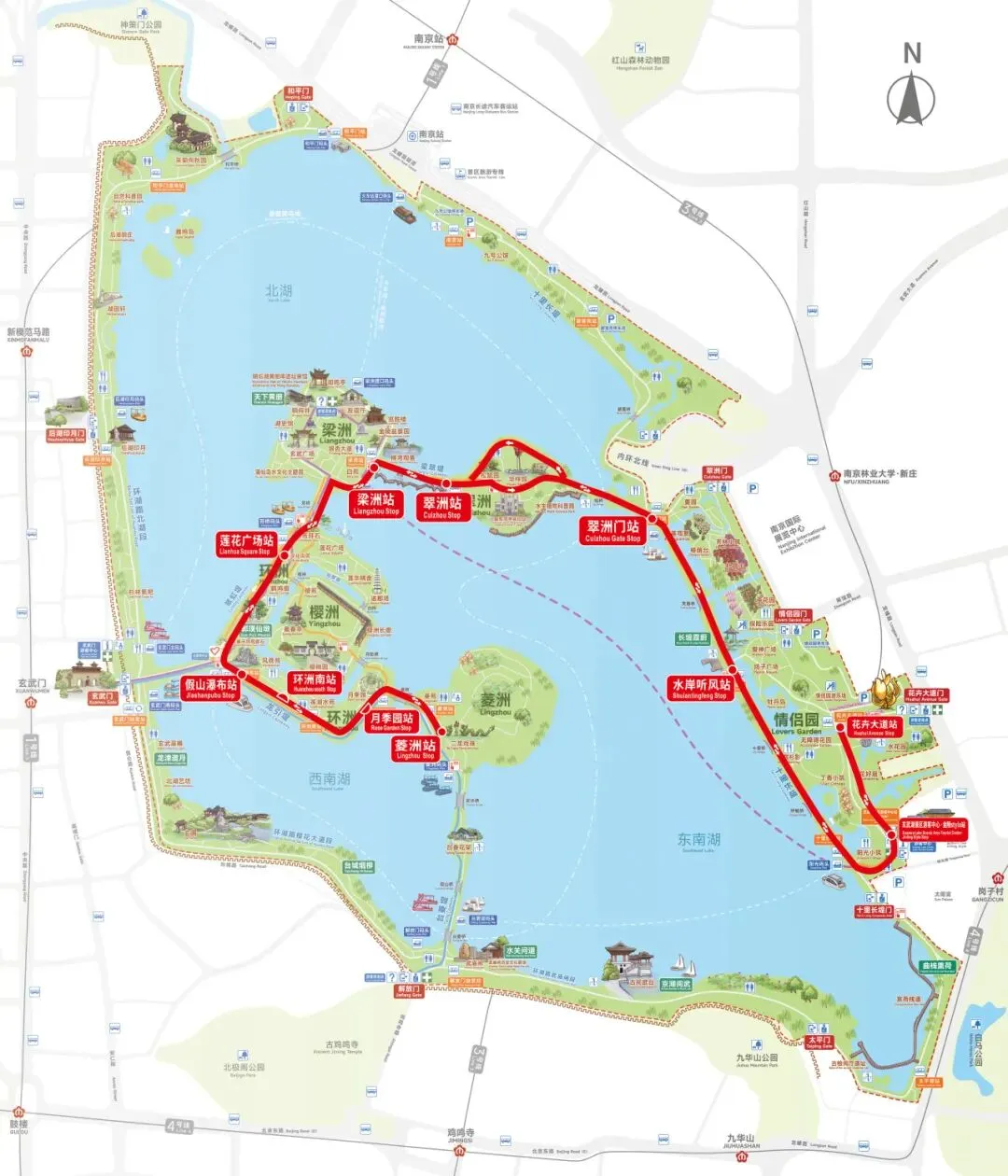 梁洲与南京车站隔湖相望,走出被誉为中国最美火车站的南京站南广场,映入眼帘的便是风光秀丽的一湖碧色,和美丽的城市天际线。乘坐火车站旁的游船码头轮渡,是直达玄武湖梁洲最便捷的水路交通。