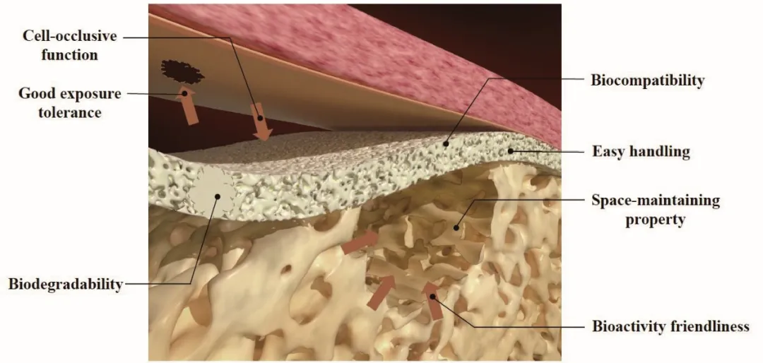 引导骨再生膜在创伤、肿瘤切除或牙周炎导致的骨缺损修复中至关重要。理想的GBR膜需要“多功能集成”:它必须兼具足够的机械强度以抵抗生理性力量、良好的柔顺性以适应不规则骨面、内部致密性以阻止软组织细胞侵入、适宜的通透性以允许营养物质输送、高的生物相容性以允许细胞贴附,同时还须具备抗菌功能以防止感染(图1)。