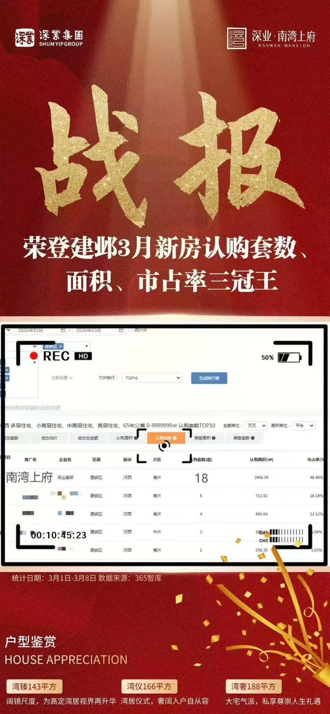 河西南的深业南湾上府,荣登3月新房认购套数、面积、市占率三冠王。