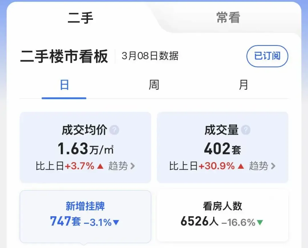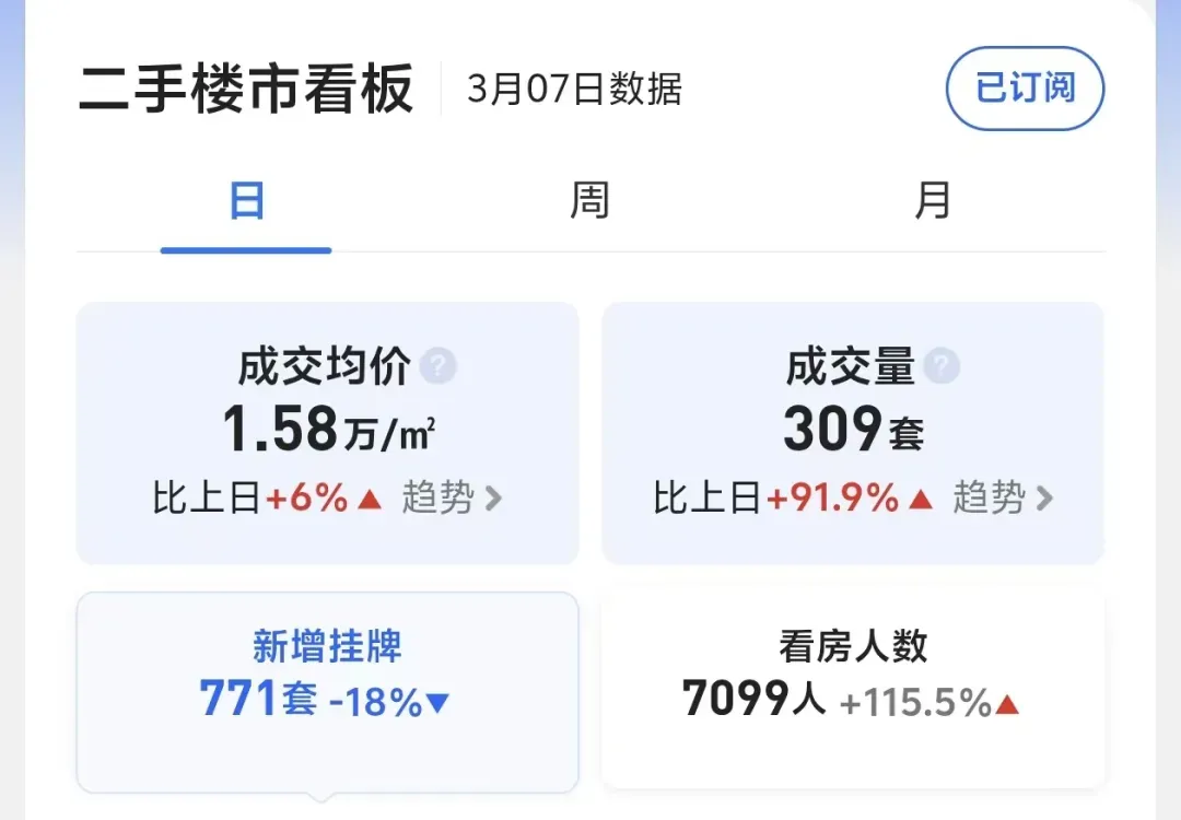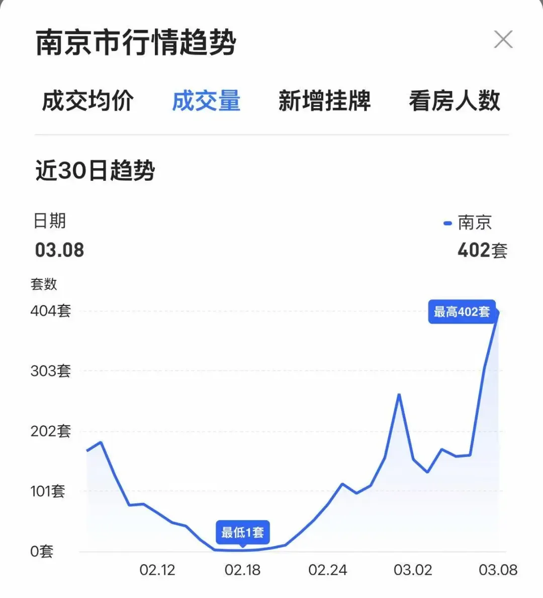 热度不仅仅体现在新房市场,我们再来看看二手房的数据。其实,南京二手房的成交量一直在高位。比如即便在新房非常冷的2025年,南京二手房的成交量也达到了约10万套的高成交,成交规模差不多是新房的三倍多。而开年以来,我们发现南京二手房的成交量,又有了强势反弹!3月7日南京二手房成交达到309套,环比上涨了91.9%,可以说是强势反弹。而到了3月8日,更是在7日的高成交上又有了上升,达到了402套,创下近一个月的新高。3月7日的数据,成交价上涨6%,成交量上涨91.9%,挂牌量下降18%,看房人数达到7099组,上涨了115.5%!到了3月8日,成交均价继续上涨3.7%,成交量上涨30.9%。要知道,往年春节前一个多月都是传统成交淡季,而今年连续2个月成交高涨。如果说1月份的突然爆火还比较让人意外的话,那么2月份的成交,则意味着情绪和信号在进一步地传导,越来越多观望的需求被提前激发出来。