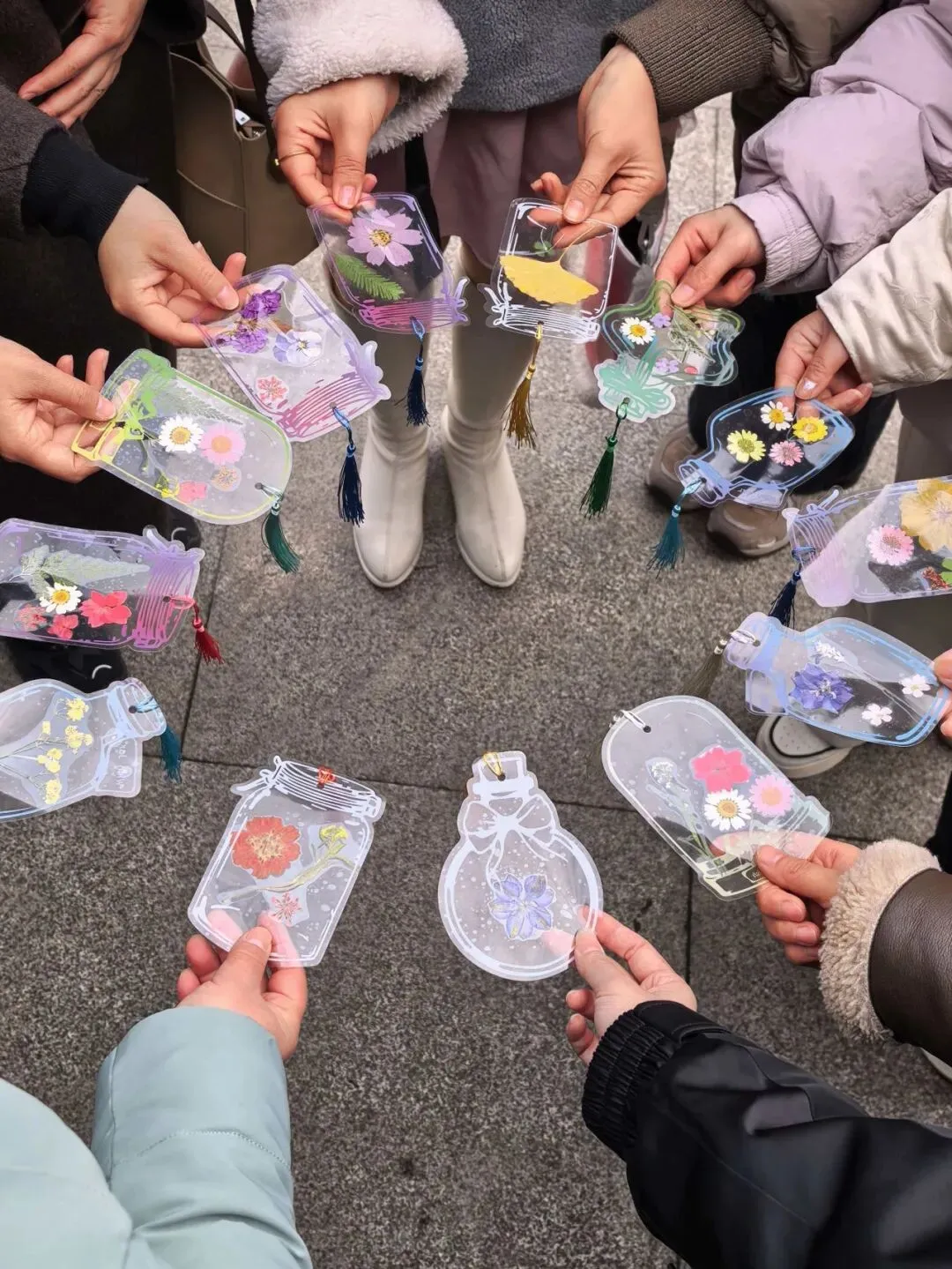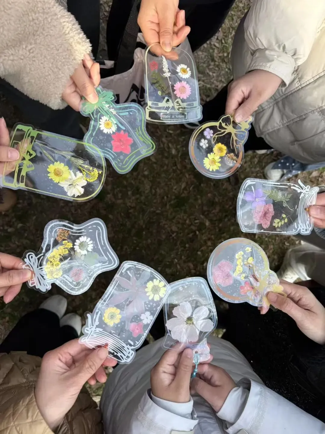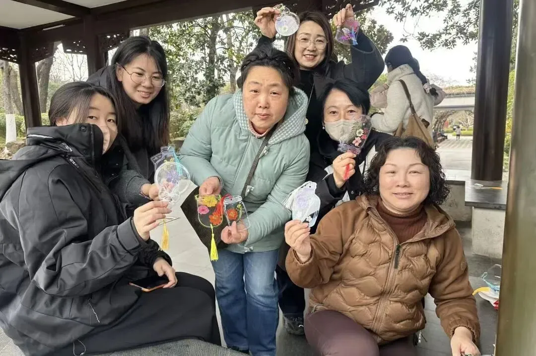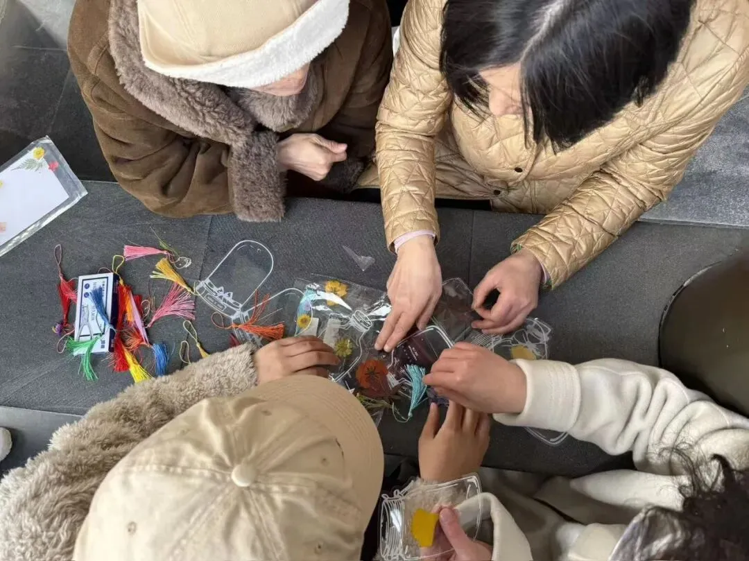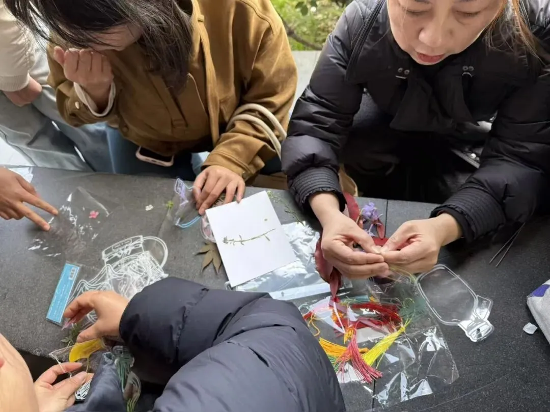 赏春健步之余,活动特别增添了干花书签手作的趣味体验。在公园长廊,大家领取了透明书签、各色干花标本、压花贴纸等材料。指尖灵动翻飞,大家将春日的浪漫“封存”进书签之中——一朵朵干花被精心巧妙组合,有的拼成繁花绽放之景,有的搭配出诗意造型。指尖流转间,一片片干花被赋予新生,化作了独一无二的春日诗篇。一枚枚别具一格的书签,承载着对生活的热爱,也成了这次活动最温馨的纪念。