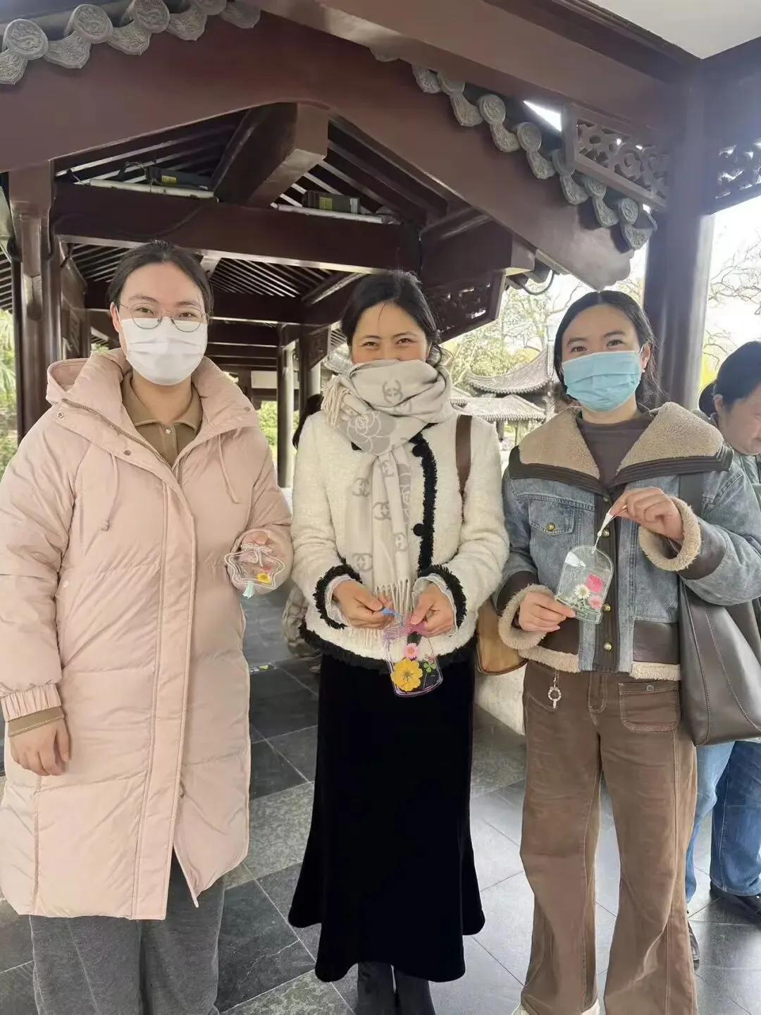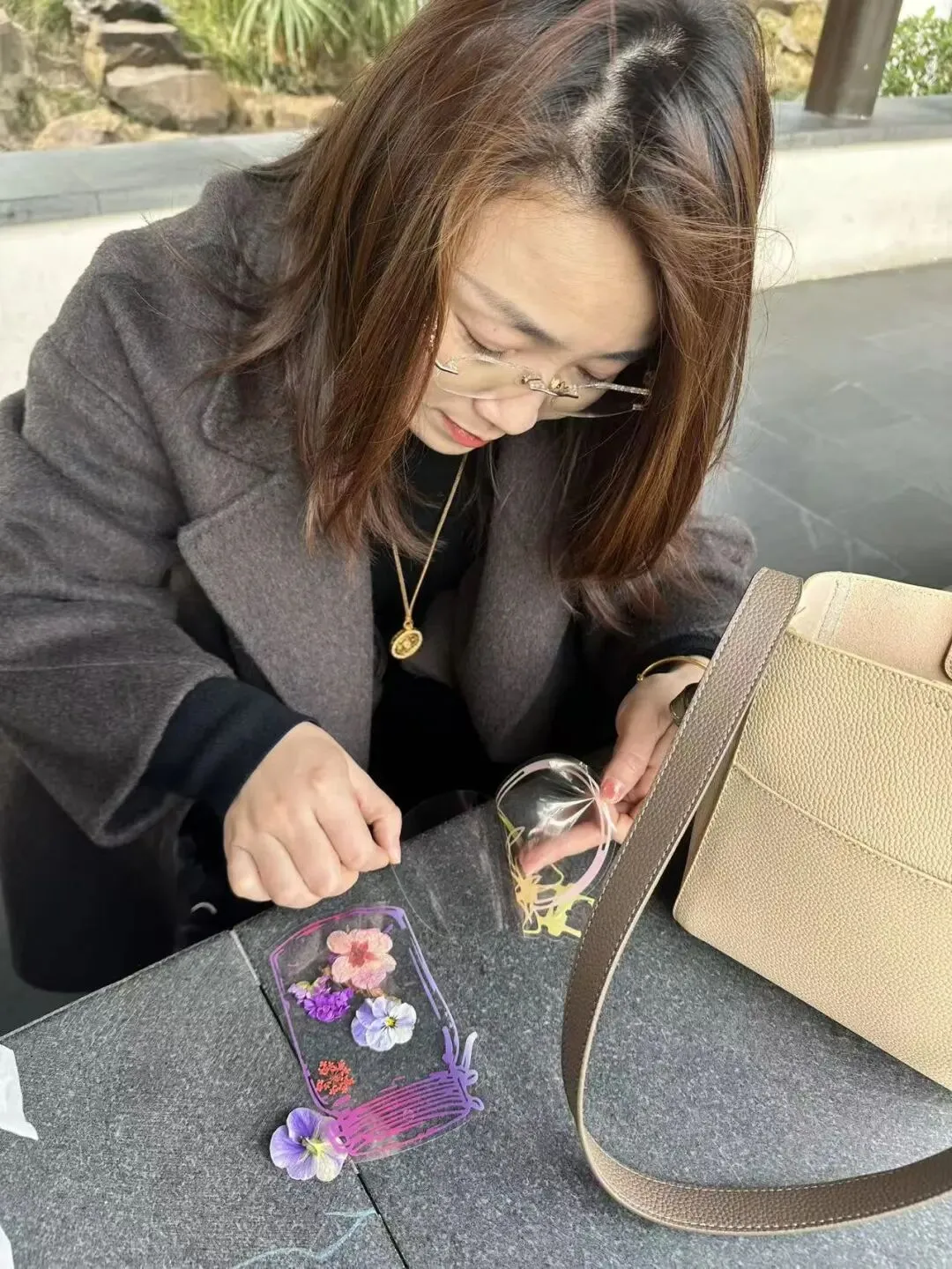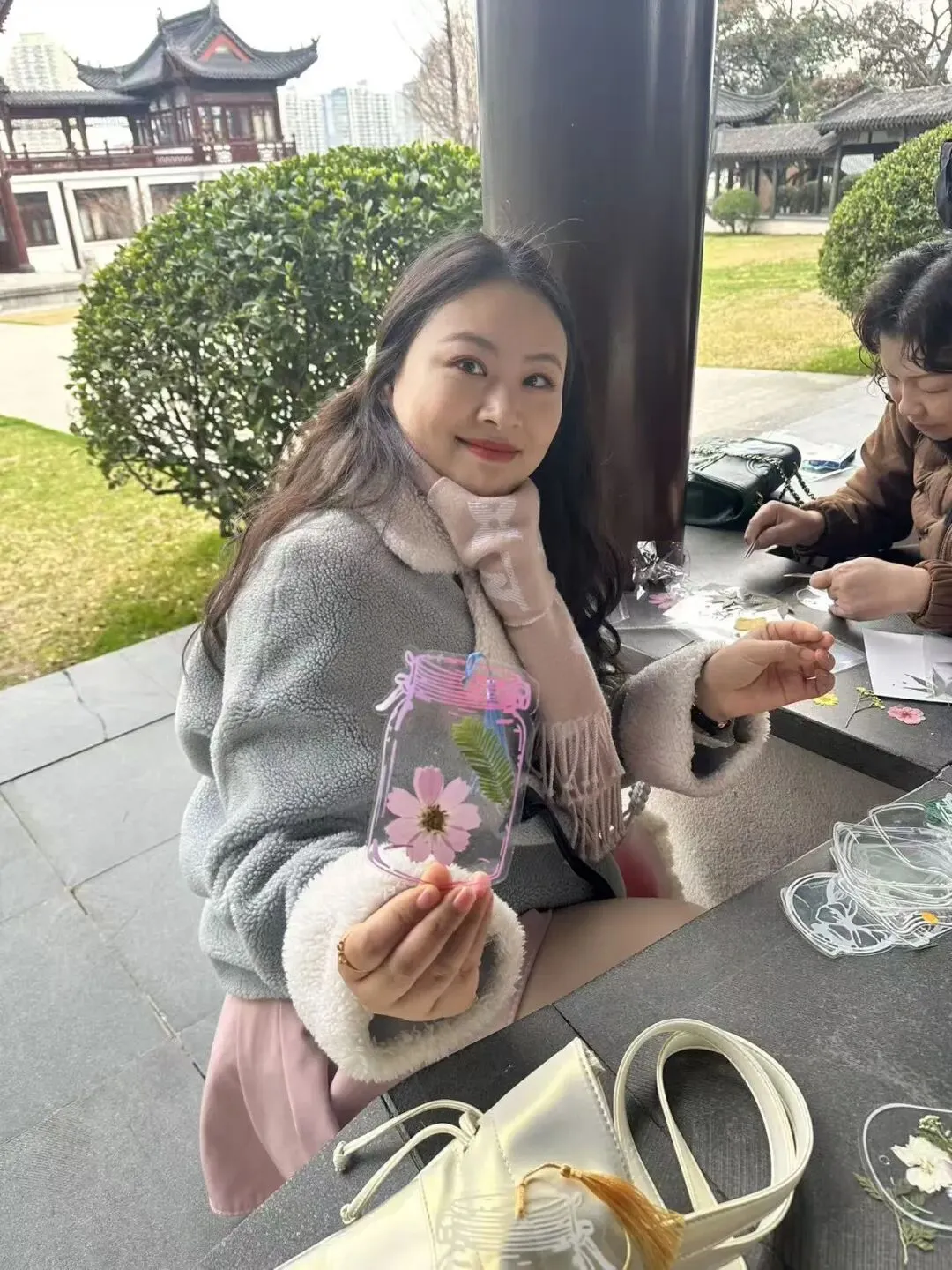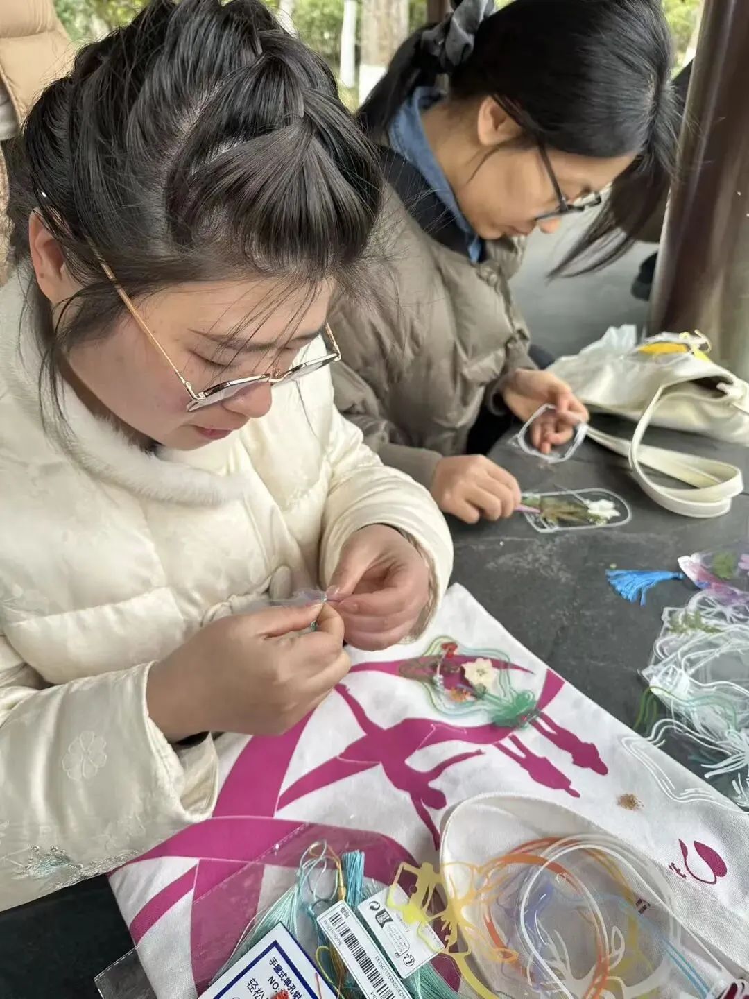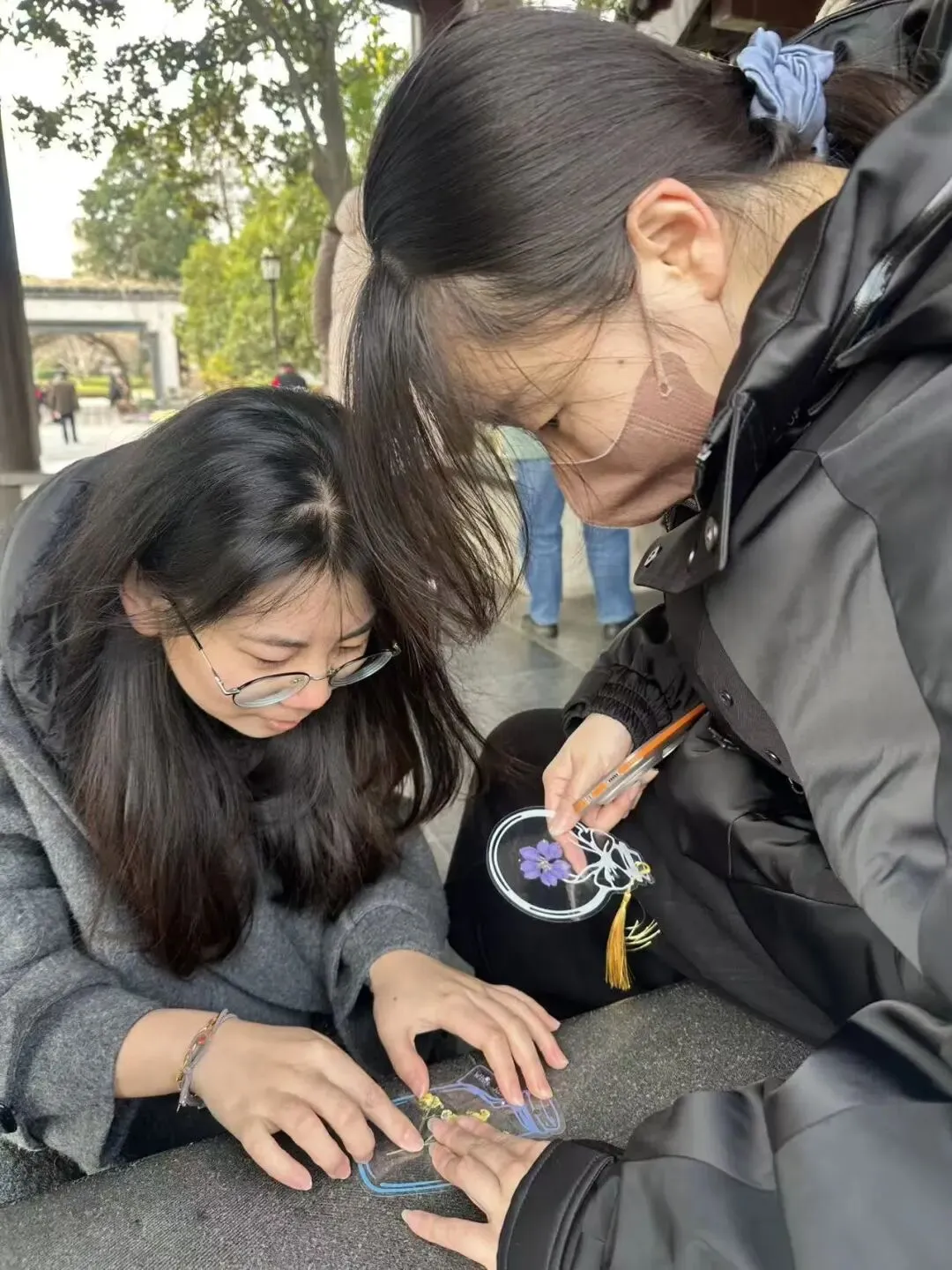 赏春健步之余,活动特别增添了干花书签手作的趣味体验。在公园长廊,大家领取了透明书签、各色干花标本、压花贴纸等材料。指尖灵动翻飞,大家将春日的浪漫“封存”进书签之中——一朵朵干花被精心巧妙组合,有的拼成繁花绽放之景,有的搭配出诗意造型。指尖流转间,一片片干花被赋予新生,化作了独一无二的春日诗篇。一枚枚别具一格的书签,承载着对生活的热爱,也成了这次活动最温馨的纪念。