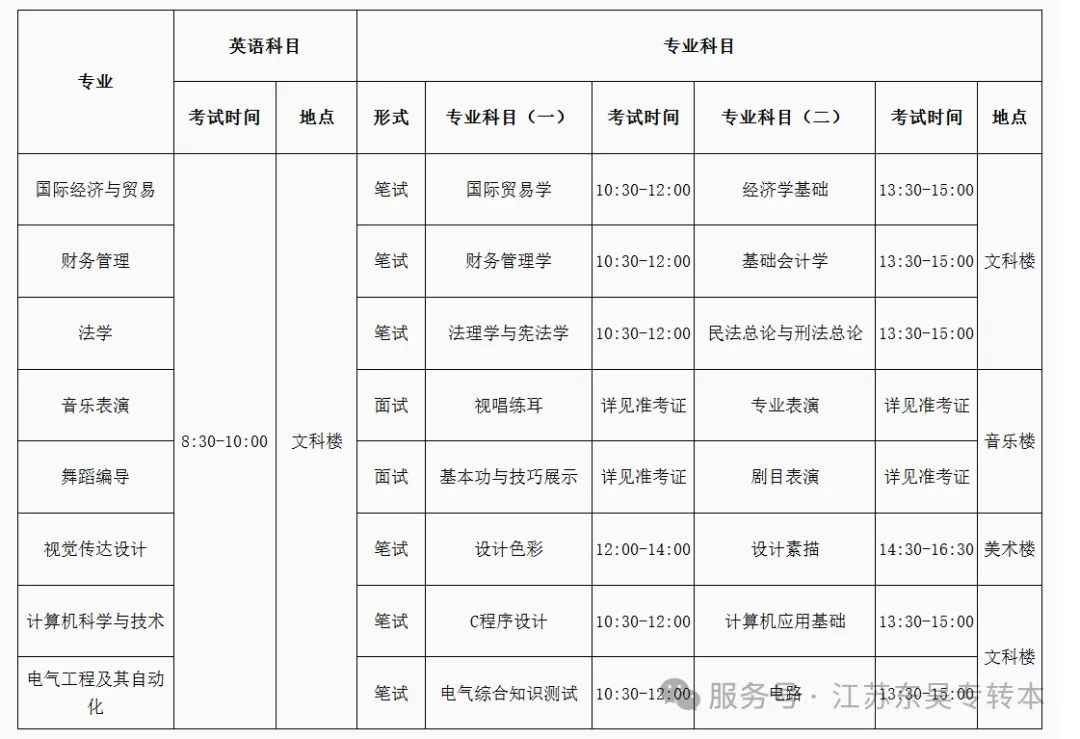 各专业考试科目安排如下表,具体考场安排见准考证。