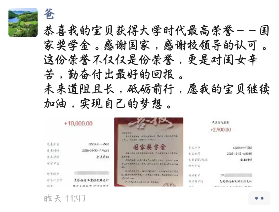 这份跨越山海的喜报,不仅让学校的育人成果与家庭的期盼温暖相融,更收获了家长们满含真情的反馈。2023级大数据与会计专业的袁铭悦同学家长在收到喜报后难掩喜悦:“恭喜我的宝贝获得大学时代最高荣誉——国家奖学金”“未来道阻且长,砥砺前行,愿我的宝贝继续加油,实现自己的梦想”。2023级计算机应用技术专业的贺博同学家长动情分享:“十年寒窗终有报”“感谢国家的培养,感谢学校的悉心栽培和老师的谆谆教诲,你的努力和才能得到了认可,汗水凝成的勋章,也是未来逐梦的起点。你很优秀,继续发光发热吧!”2024级婴幼儿托育服务与管理专业的王玉洁同学家长激动感言:“恭喜女儿获得学校最高荣誉院长特别奖学金。感谢学校的培育和老师的教诲。希望女儿不负期望,踏实向上,也祝南京城市职业学院越办越好,培育更多人才!”朴实的话语,既是对孩子过往奋斗的肯定,也是对学校教育工作的高度认可,更饱含着对孩子未来成长的殷切期许。