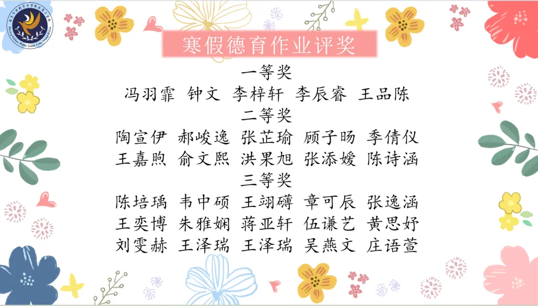 随后,主持人宣读了本次假期德育作业获奖名单,对表现优异的同学予以表彰:
