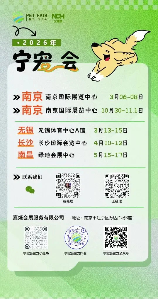 从政策东风下的全新升级,到全民参与的狂欢盛宴,2026 嘉烁宁宠会不仅呼应了南京 “一产业集群一品牌展会” 的展产融合要求,更贴合 “商文旅体展康跨界融合” 的发展方向。