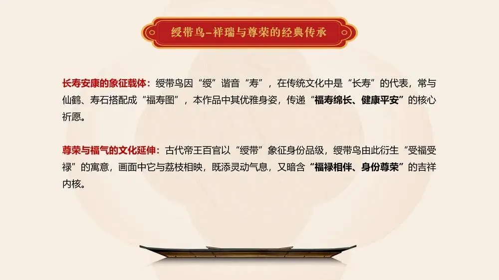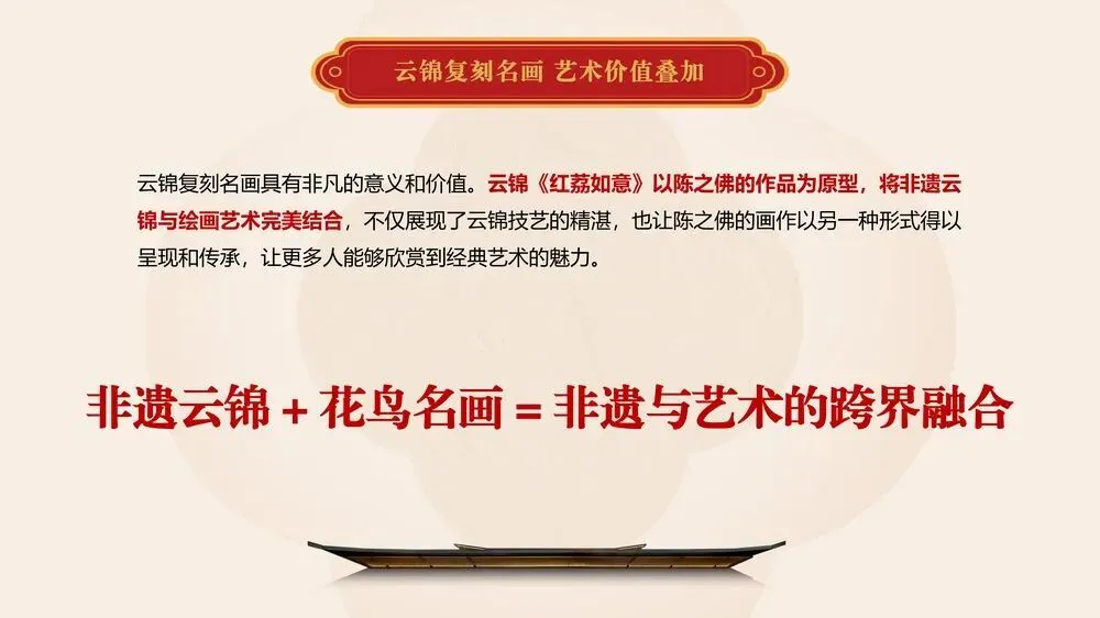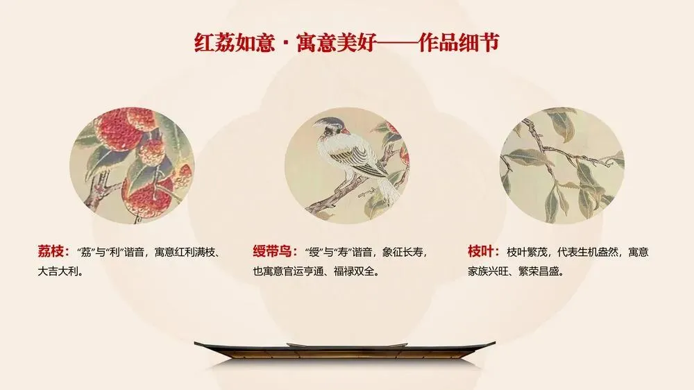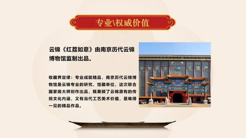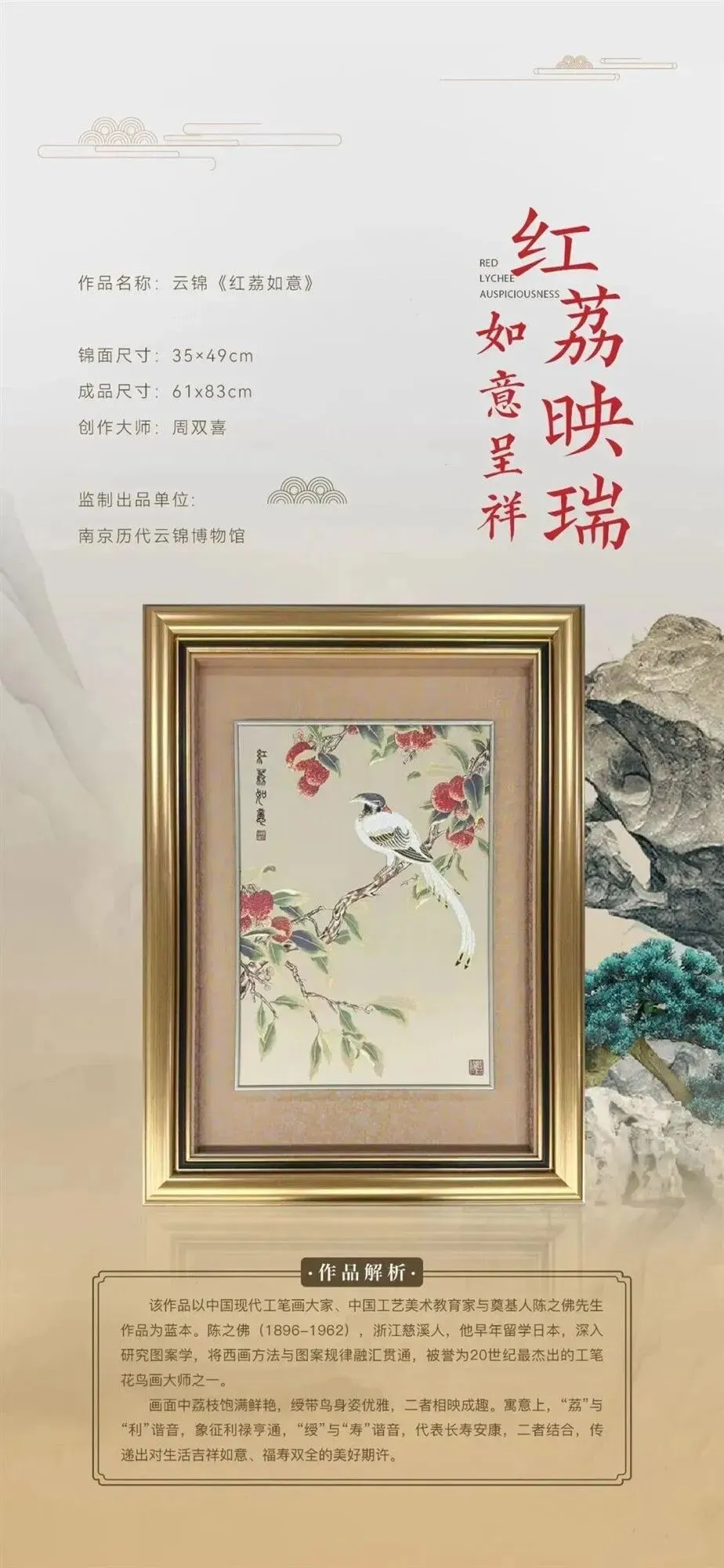 该作品以中国现代工笔画大家、中国工艺美术教育家与奠基人陈之佛先生作品为蓝本,由南京云锦国家级非物质文化遗产代表性传承人周双喜大师创作,运用云锦技艺精心织造。锦面图案上,荔枝饱满鲜艳,绶带鸟身姿优雅,二者相映成趣。寓意上,“荔”与“利”谐音,象征利禄亨通,“绶”与“寿"谐音,代表长寿安康,二者结合,传递出对生活吉祥如意、福寿双全的美好期许。