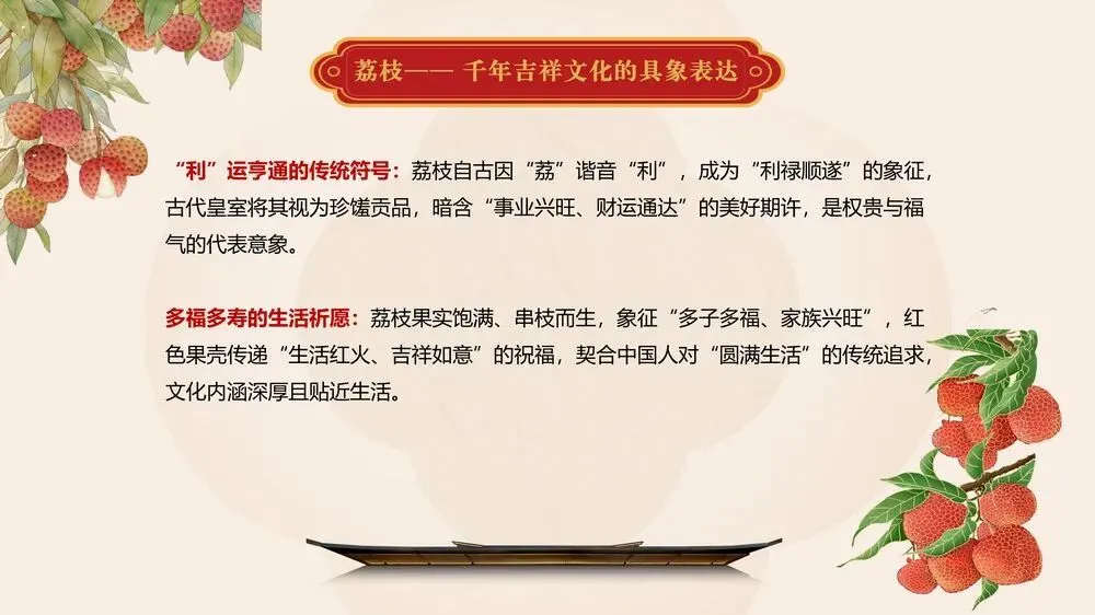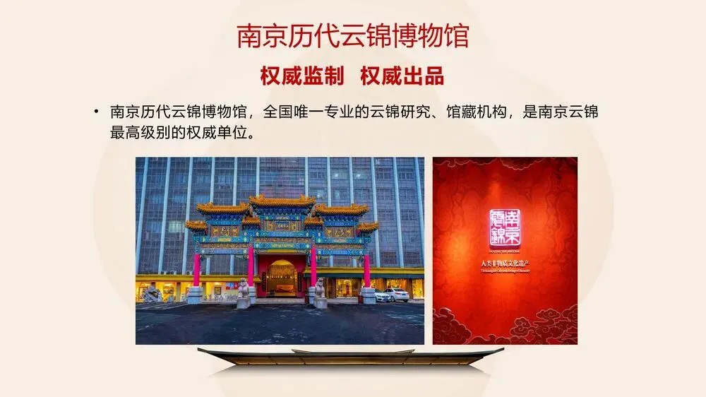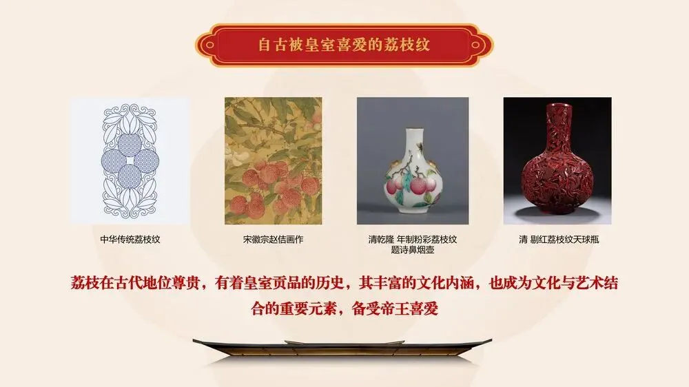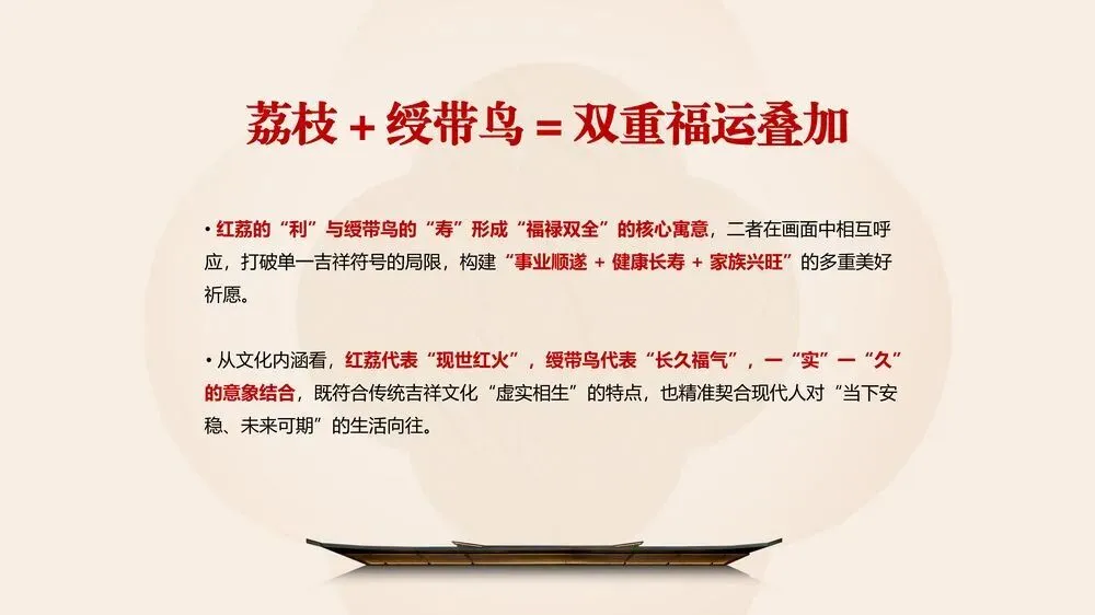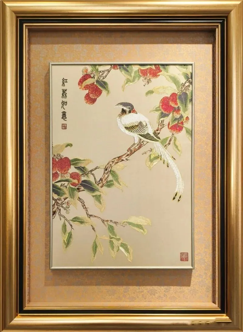 该作品以中国现代工笔画大家、中国工艺美术教育家与奠基人陈之佛先生作品为蓝本,由南京云锦国家级非物质文化遗产代表性传承人周双喜大师创作,运用云锦技艺精心织造。锦面图案上,荔枝饱满鲜艳,绶带鸟身姿优雅,二者相映成趣。寓意上,“荔”与“利”谐音,象征利禄亨通,“绶”与“寿"谐音,代表长寿安康,二者结合,传递出对生活吉祥如意、福寿双全的美好期许。