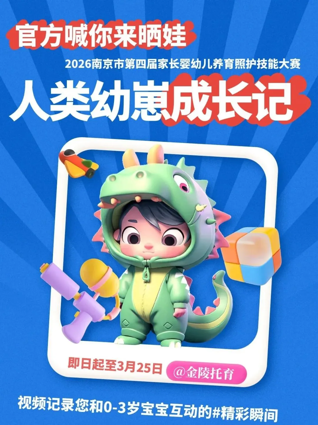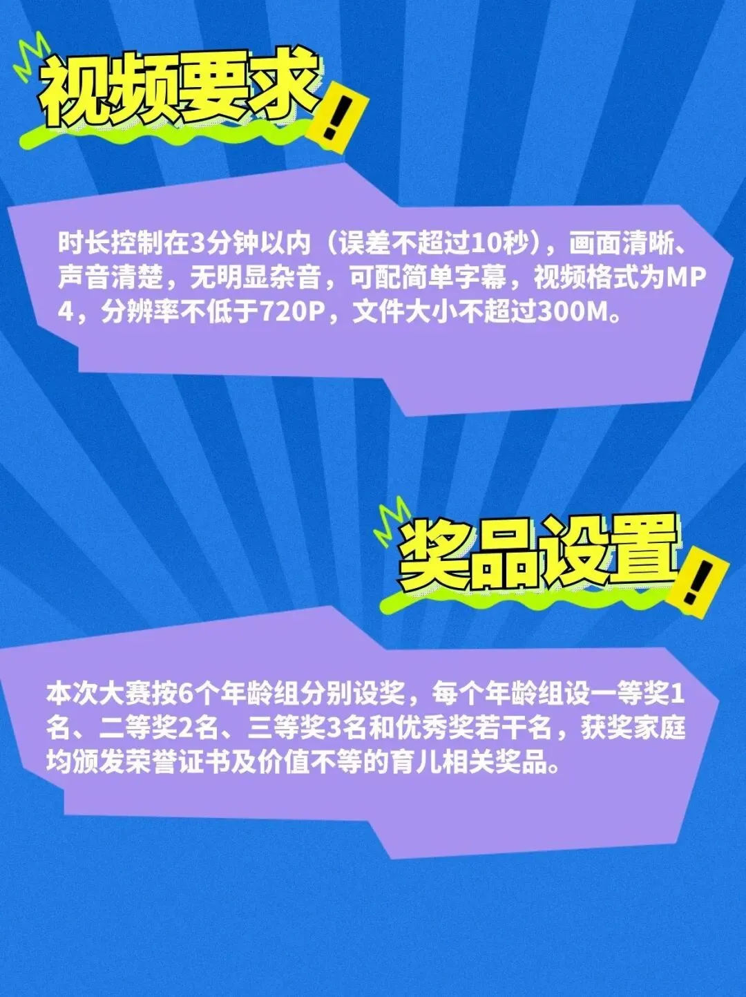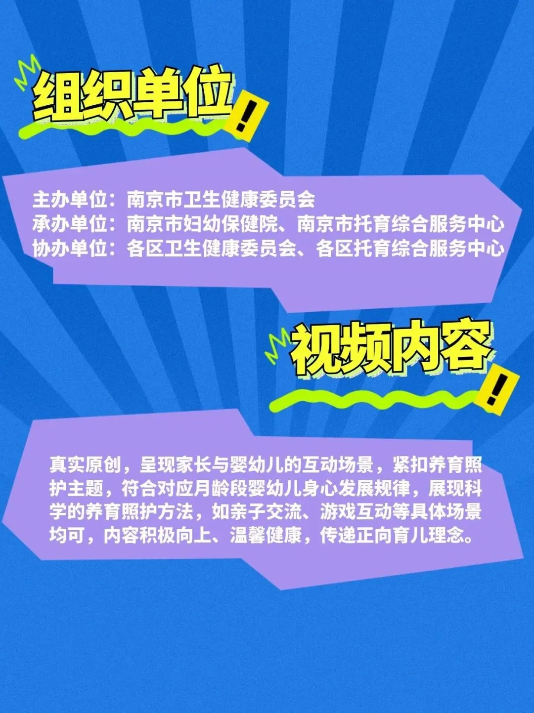 参与非常简单:只需按照要求提交一段3分钟以内亲子互动视频承办单位:南京市妇幼保健院、南京市托育综合服务中心协办单位:各区卫生健康委员会、各区托育综合服务中心1.内容要求:真实原创,呈现家长与婴幼儿的互动场景,紧扣养育照护主题,符合对应月龄段婴幼儿身心发展规律,展现科学的养育照护方法,如亲子交流、游戏互动等具体场景均可,内容积极向上、温馨健康,传递正向育儿理念。