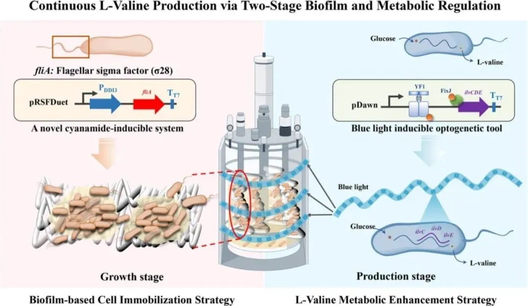 本研究针对上述挑战,开发了一种两阶段工程策略,将生物被膜介导的固定化与靶向代谢途径强化相结合,为实现L-缬氨酸连续发酵提供了创新解决方案。