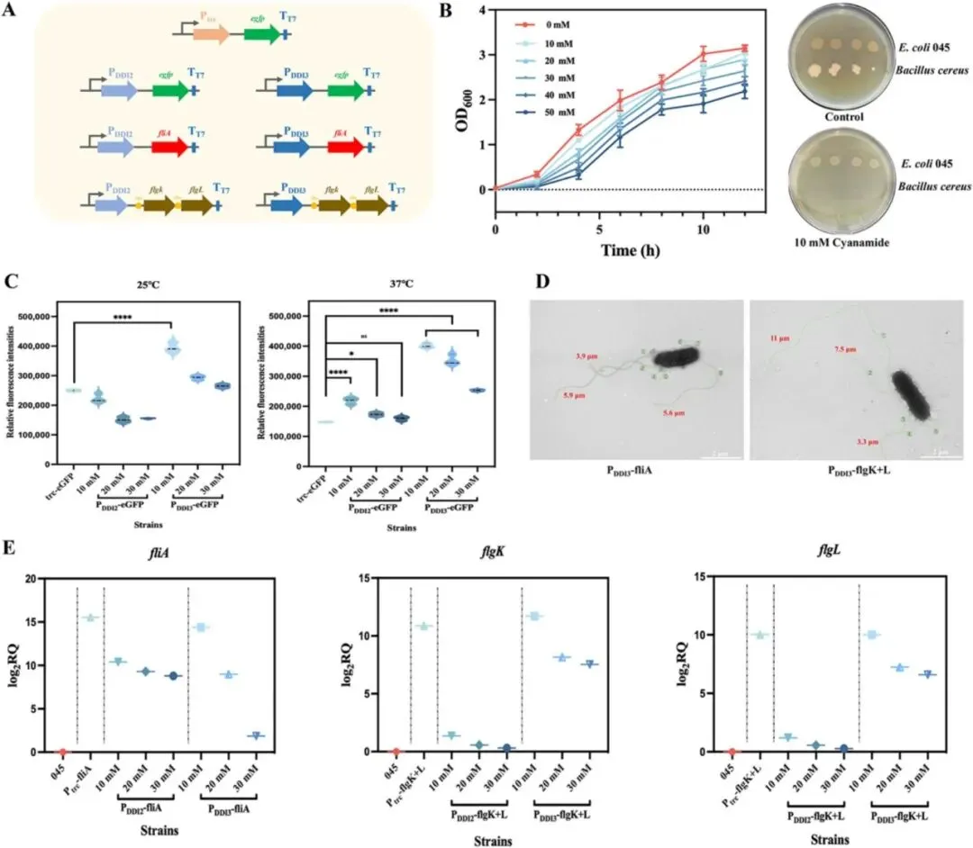 采用CRISPR-Cas9辅助同源重组进行基因敲除。针对目标基因设计sgRNA克隆至pTarget,共转化携带同源臂的供体DNA片段进行编辑。阳性克隆经菌落PCR筛选并经Sanger测序确认。根据标准分子克隆技术,将相应编码序列插入pTrc99a和pRSFDuet质粒构建氰胺诱导系统。同样,采用pACYCDuet和pDawn质粒用于光遗传学介导的L-缬氨酸代谢系统调控。为评估鞭毛运动性对生物被膜形成的影响,构建过表达motA+B、flgM、fliA、flgK+L等的菌株。合成启动子PDDI2和PDDI3用于pRSFDuet衍生载体中的可调表达,光诱导表达通过pDawn系统实现。