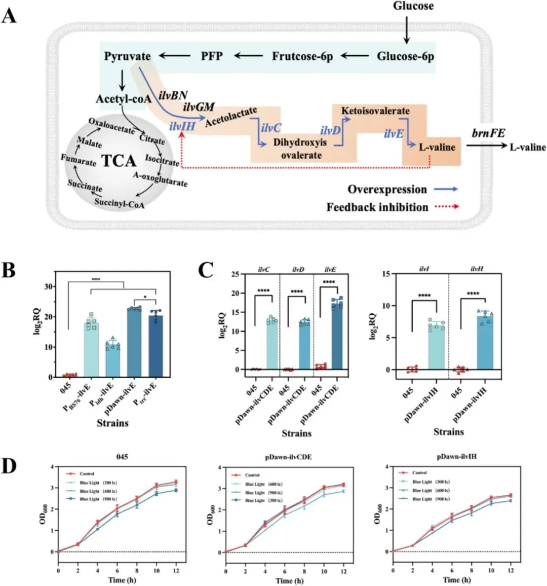 本研究所用菌株和质粒汇总于表S1和S2,引物序列见表S3。采用pCas和pTarget质粒进行基因组编辑,pTrc99a、pRSFDuet、pACYCDuet和pDawn用于基因表达。大肠杆菌045菌株作为L-缬氨酸生产菌株和遗传改造的出发菌株。大肠杆菌在LB培养基中37°C培养,添加异丙基-β-D-硫代半乳糖苷(IPTG)、氰胺和蓝光诱导基因表达。