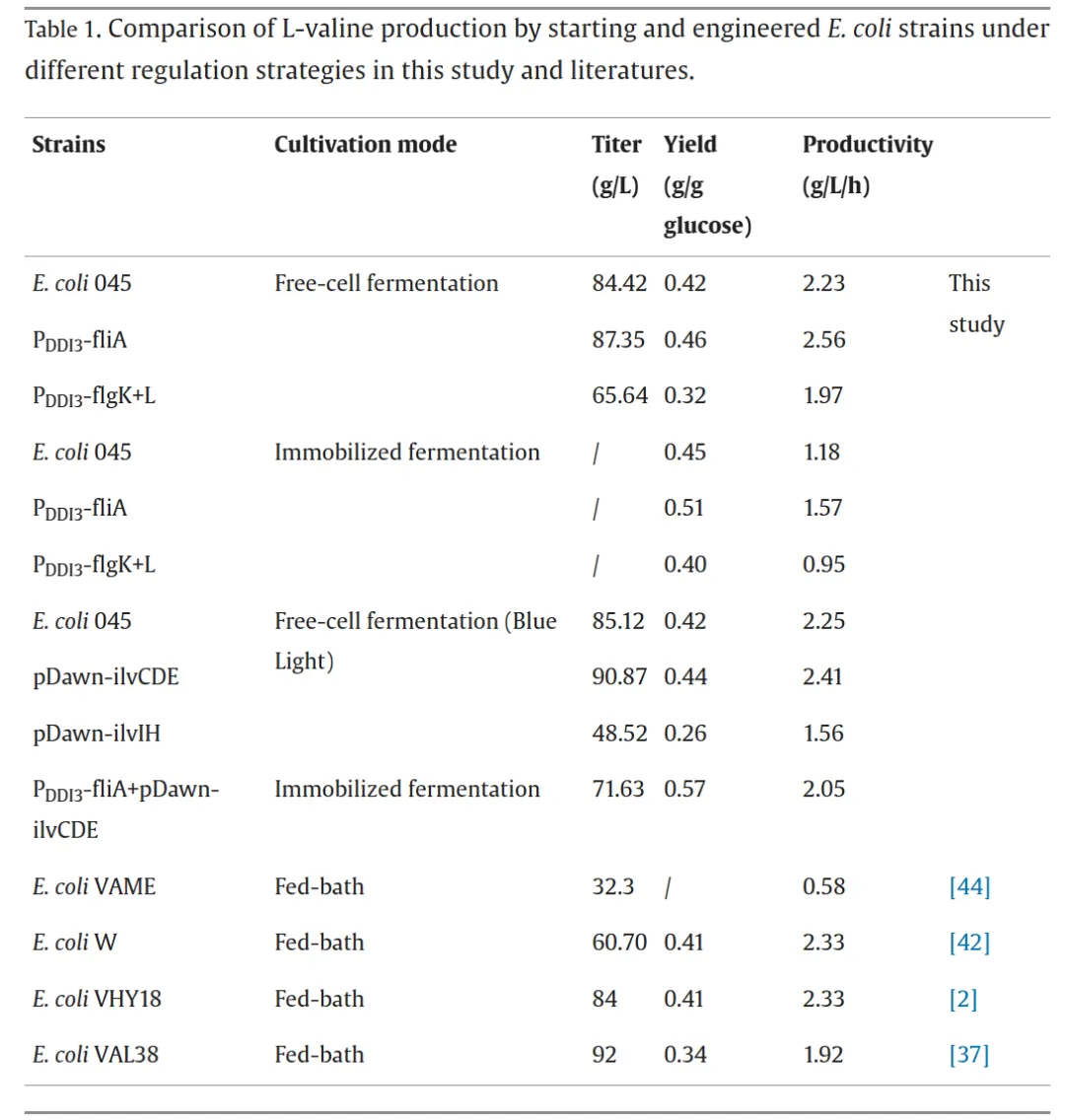 3.1 鞭毛运动性基因对大肠杆菌生物被膜形成的影响如图1A所示,研究选取一组鞭毛及运动性相关基因,包括motA、motB、fliA、flgM、flgN、flgK和flgL进行遗传操作,探究其在大肠杆菌生物被膜形成中的作用。为增强生长早期至生物被膜发育阶段的细菌运动性,通过质粒表达构建了过表达菌株motA+B、flgM、fliA、flgN、flgK、flgL和flgK+L。同时采用CRISPR-Cas9系统构建了fliA、flgN、flgK和flgL的敲除菌株,以阐明鞭毛功能和运动性对生物被膜形成的影响。结果显示,与出发菌株大肠杆菌045相比,+fliA和+flgK+L菌株的生物被膜形成显著增强,分别提高了41.14%和39.87%,而敲除菌株呈现相反趋势(图1B)。图1 鞭毛相关基因对大肠杆菌运动性和生物被膜形成的调控通过TEM分析各菌株的鞭毛形态差异和数量(图1C)。与大肠杆菌045相比,鞭毛数量明显增加。+flgK+L菌株不仅表现出更多鞭毛,鞭毛长度也显著增加,证实fliA和flgK+L在鞭毛表型中发挥重要调控作用。游动和群集运动性测定表明,与大肠杆菌045不同,motA+B、fliA和flgK+L的过表达显著增强了细胞运动性,而其他基因影响甚微。运动性对大肠杆菌生物被膜形成的起始至关重要。大肠杆菌的鞭毛为细胞提供向表面运动所需的运动性,驱动初始粘附,从而促进生物被膜形成。鉴于鞭毛运动相关基因调控对生物被膜形成的积极影响,研究构建了新型氰胺诱导表达系统以进一步增强生物被膜发育(图2A),同时可在生长阶段降低杂菌污染风险。尽管氰胺具有一定细胞毒性,但OD600的波动表明10 mM氰胺对细胞生长影响最小(图2B)。随着氰胺浓度升高,其对大肠杆菌生长增殖的抑制作用更为明显。值得注意的是,10 mM氰胺诱导对主要污染源蜡样芽孢杆菌的抑制作用显著且明显。为成功构建氰胺诱导表达系统,将酿酒酵母来源的DDI2和DDI3启动子经密码子优化后在大肠杆菌中表达。令人惊讶的是,两个DDI启动子均表现出温度非依赖性诱导,这对大肠杆菌所需的恒温发酵有利。相比之下,以Ptrc-eGFP菌株为对照,25°C和37°C下的荧光强度结果表明trc启动子呈温度依赖性(图2C)。此外,DDI3启动子在10 mM氰胺下诱导效率最高,与图2B趋势一致。通过定量fliA、flgK和flgL的表达进一步证实,DDI3启动子在选定诱导条件下有效驱动这些基因的转录(图2E)。值得注意的是,DDI3启动子的引入不仅增加了鞭毛数量,还延长了鞭毛长度,PDDI3-fliA和PDDI3-flgK+L菌株的生物被膜形成分别提高了54.7%和68.8%(图2D)。SEM和CLSM图像显示,通过过表达fliA和flgK+L介导的鞭毛运动性增强了细胞聚集,形成更致密、更有结构的生物被膜。总体而言,稳健的细胞聚集和生物被膜形成与强化发酵和产物转化密切相关。L-缬氨酸产量测定显示,大肠杆菌045、PDDI3-fliA和PDDI3-flgK+L分别为84.42 g/L、87.35 g/L和65.64 g/L。PDDI3-fliA的生产强度(2.56 g/L/h)和葡萄糖转化率(0.46 g/g)也略高于大肠杆菌045(2.23 g/L/h和0.42 g/g)和PDDI3-flgK+L(1.97 g/L/h和0.32 g/g)。值得注意的是,工程菌PDDI3-fliA比大肠杆菌045更早转入生产阶段,这可能有助于缩短发酵周期并提高生产力。相反,PDDI3-flgK+L的L-缬氨酸产量大幅下降,可能归因于工程改造导致的代谢平衡显著破坏。3.3 蓝光激活L-缬氨酸代谢的光遗传学调控及两阶段策略在连续发酵中的应用除在生长阶段构建氰胺诱导表达系统促进生物被膜形成外,研究还通过蓝光激活进一步调控L-缬氨酸代谢通量。根据L-缬氨酸的主要生物合成途径(图3A),葡萄糖作为唯一碳源,被大肠杆菌吸收后通过糖酵解途径代谢产生丙酮酸,经系列酶促反应最终转化为L-缬氨酸。其中关键酶包括乙酰羟酸合成酶III(AHAS III,由ilvIH编码)、乙酰羟酸异构还原酶(ilvC)、二羟酸脱水酶(ilvD)和转氨酶(ilvE)。为确保高效酶表达,以ilvE为报告基因筛选组成型启动子PBS76、厌氧启动子Pldh和蓝光诱导光遗传学质粒pDawn(图3B)。尽管原有的两阶段发酵过程涉及有氧生长阶段后厌氧催化,但研究发现蓝光诱导的pDawn质粒使ilvE表达量最高。值得注意的是,尽管trc启动子具有高诱导表达特性,但ilvE的表达量(0.5 mM IPTG)明显低于pDawn。在蓝光诱导下,L-缬氨酸代谢途径关键基因(ilvC、ilvD、ilvE、ilvH、ilvI)的表达均显著增强(图3C),有力验证了光遗传学调控在L-缬氨酸代谢途径中的可行性。进一步评估不同光强下pDawn-ilvCDE和pDawn-ilvIH菌株的生长情况(图3D),在光强低于900 lx时,pDawn-ilvCDE与大肠杆菌045生长趋势相似,而pDawn-ilvIH出现生长抑制,可能归因于ilvIH过表达导致的代谢失衡或辅因子耗竭。在各测试基因中,ilvCDE被证实效果最佳,并被选用于增强L-缬氨酸生产。这一结论也通过代谢工程菌株pDawn-ilvCDE和pDawn-ilvIH的游离细胞发酵实验得到验证。在发酵36小时,大肠杆菌045、pDawn-ilvCDE和pDawn-ilvIH的L-缬氨酸产量分别达到85.12 g/L、90.87 g/L和48.52 g/L。其中,pDawn-ilvCDE菌株的平均生产强度和葡萄糖转化率分别为2.41 g/L/h和0.44 g/g,高于大肠杆菌045和pDawn-ilvIH。出乎意料的是,pDawn-ilvIH表现出L-缬氨酸产量和细胞生长的显著下降。在600 lx光强下进一步明确诱导时间,提前2小时诱导(从14小时调至12小时)使L-缬氨酸产量提高13.92%。基于生长阶段氰胺诱导表达系统和生产阶段代谢途径精细调控的构建,最终将两阶段调控策略整合应用于L-缬氨酸连续发酵。具体而言,构建了双质粒共表达菌株PDDI3-fliA+pDawn-ilvCDE(图4A),发酵生物反应器的物理设置如图4B所示。在整个连续发酵过程中,固定化的PDDI3-fliA+pDawn-ilvCDE保持高细胞活力和