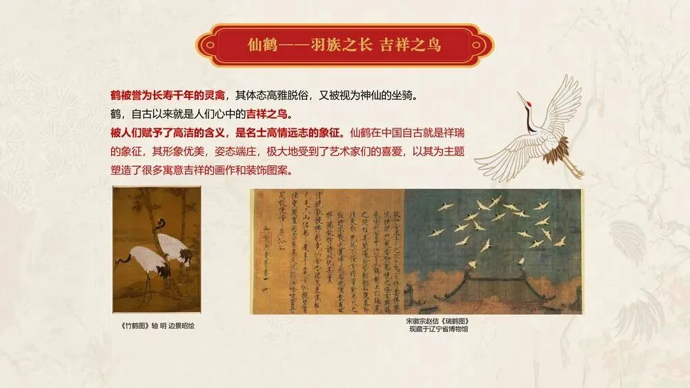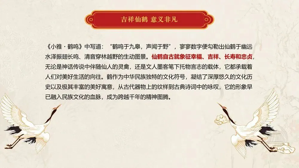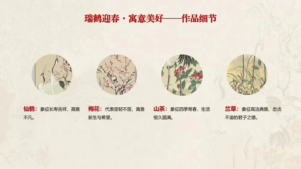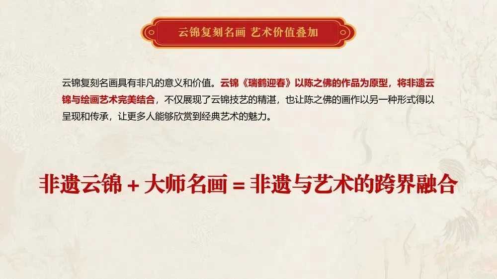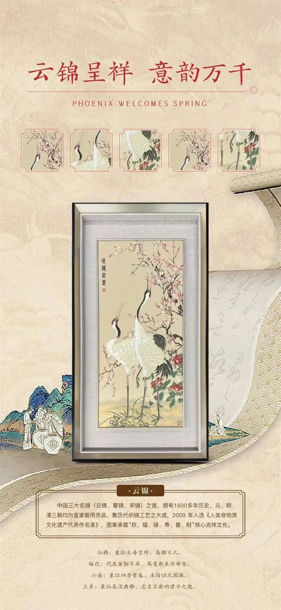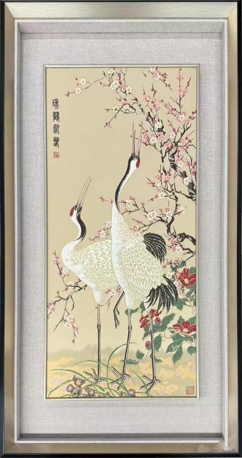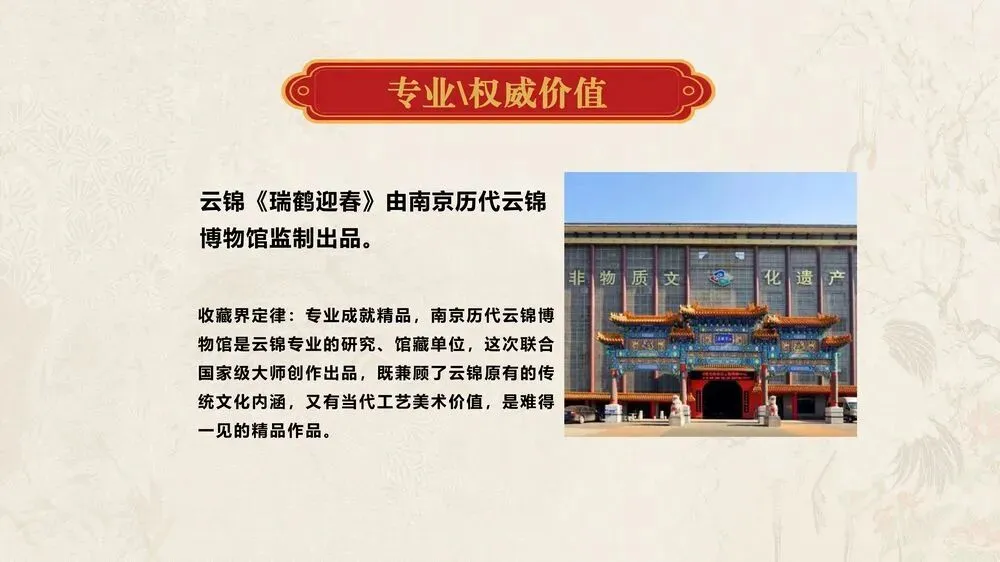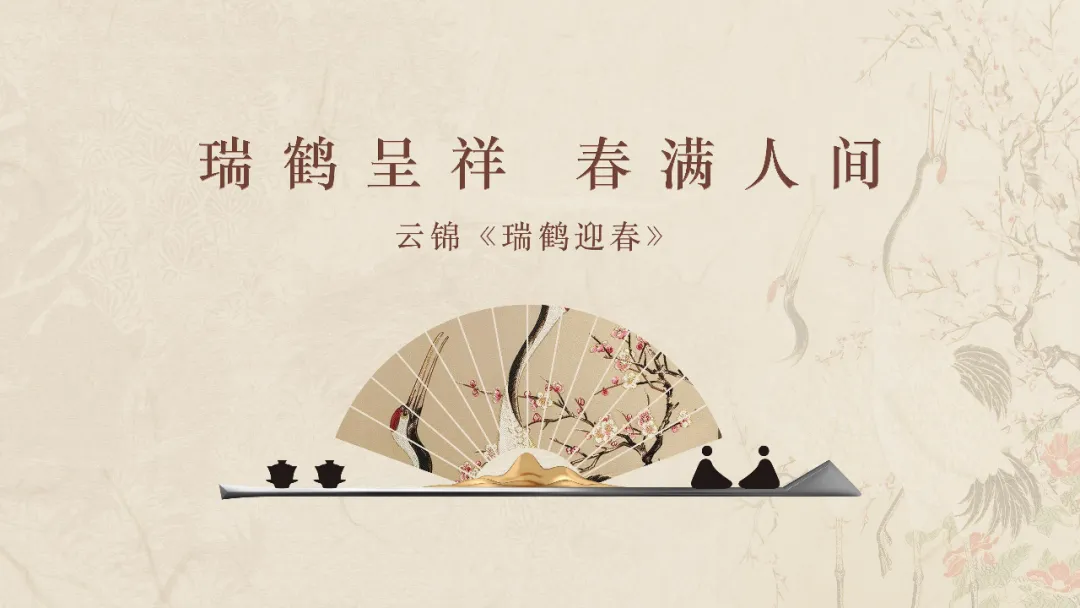 画面寓意:该作品以中国现代工笔画大家、中国工艺美术教育家与奠基人陈之佛先生作品为蓝本,由南京云锦国家级非物质文化遗产代表性传承人周双喜大师创作,运用云锦技艺精心织造。锦面上,两只仙鹤姿态优雅,周围梅花绽放,洁白的花瓣与仙鹤的素净相衬。仙鹤是长寿、吉祥的象征,代表着福气与安康,梅花则象征着坚韧与希望,也寓意着春天的到来和新的开始。整幅作品传递出对新春的期盼,以及对幸福、长寿、吉祥生活的美好祝愿。