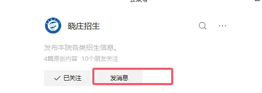一、微信搜索“晓庄招生”微信公众号并关注,然后点击“发消息”。