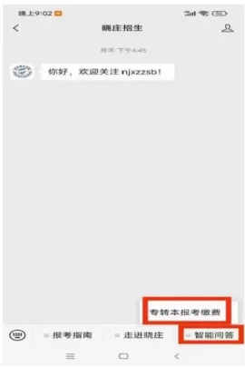二 、点击右下角“智能问答”,再点击“专转本报考缴费”。