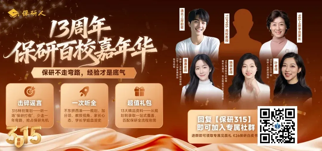 新学期伊始,保研人集结深耕行业多年、经验丰富的顶流IP,晓微老师、潘潘老师、叶老师领衔,集齐含金量更高、视角更多元、更贴近保研一线的分享嘉宾,更有985高校教授、保研清北的学员家长、清北上岸前辈等从干货分享到自由开放麦,25保研趋势复盘+26保研冲刺打响!