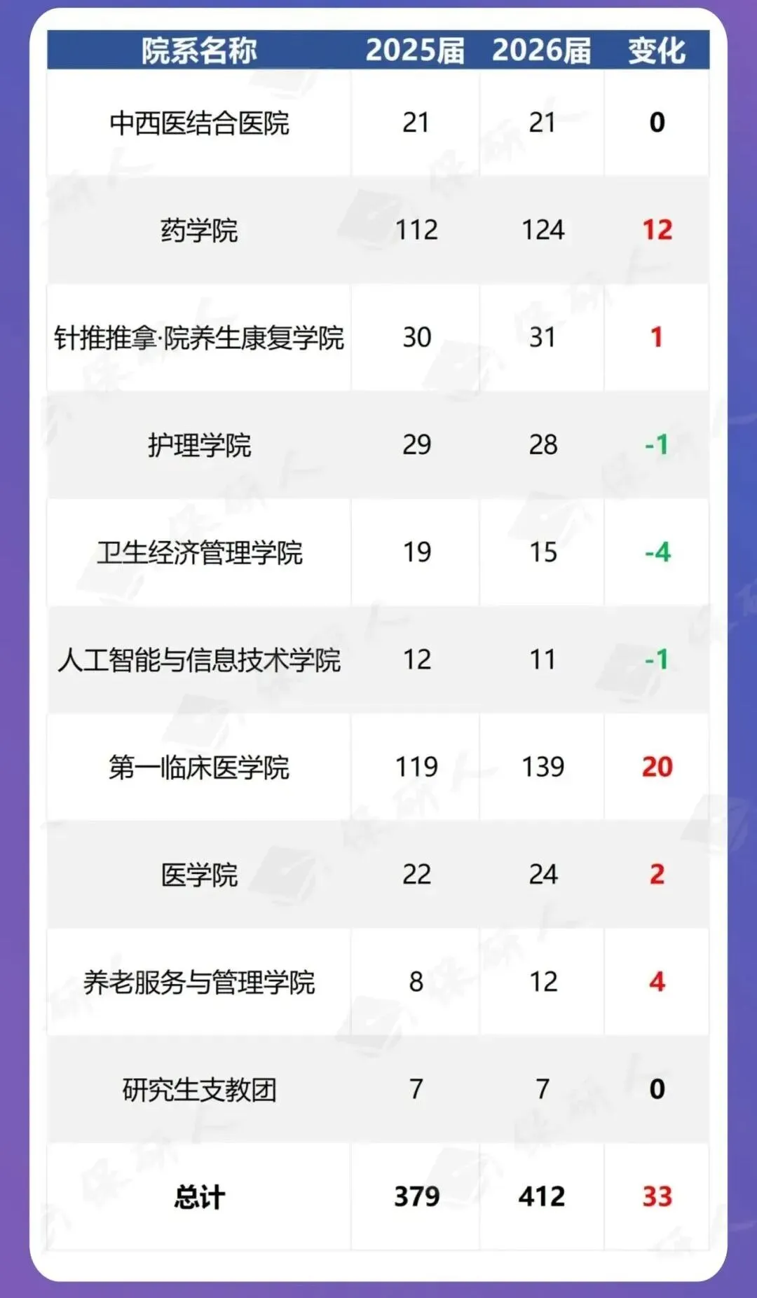 从动态变化来看,2026届毕业人数为2755人(不含中医定向、特定长学制等),多数学院指标增长,其中第一临床医学院涨幅最大(增加20人),药学院增加12人,养老服务与管理学院、医学院等也有小幅增长,少数学院名额小幅回落(卫生经济管理学院减少4人,护理学院、人工智能与信息技术学院各减少1人),中西医结合学院指标与上届持平。