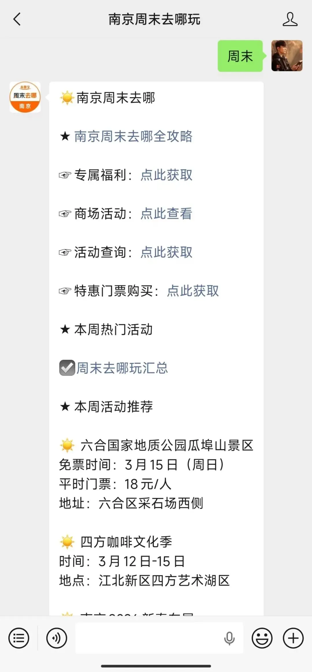 小编提醒:扫描下方二维码,关注【南京周末去哪玩】公众号,点击发消息,后台回复【周末】即可获取南京周末去哪全攻略、专属福利领取入口、商场活动、特惠门票购买等信息。