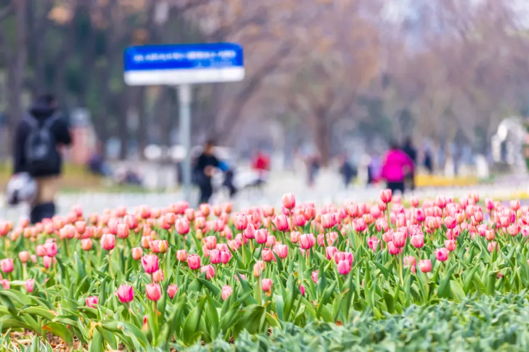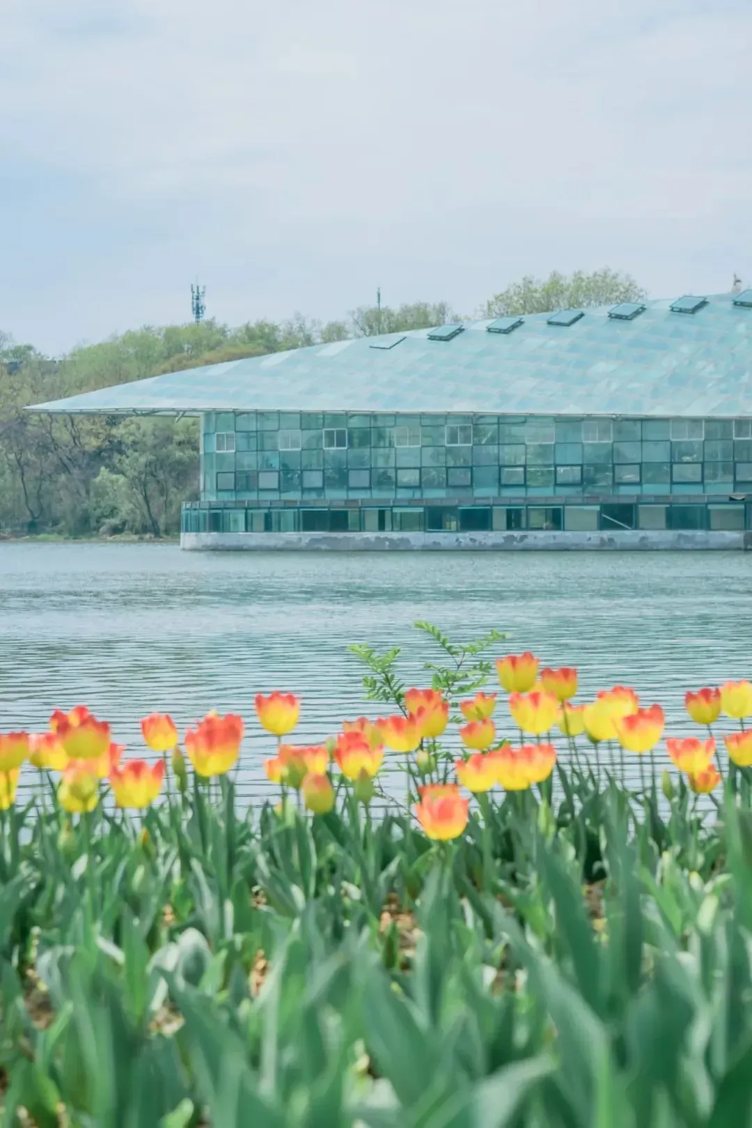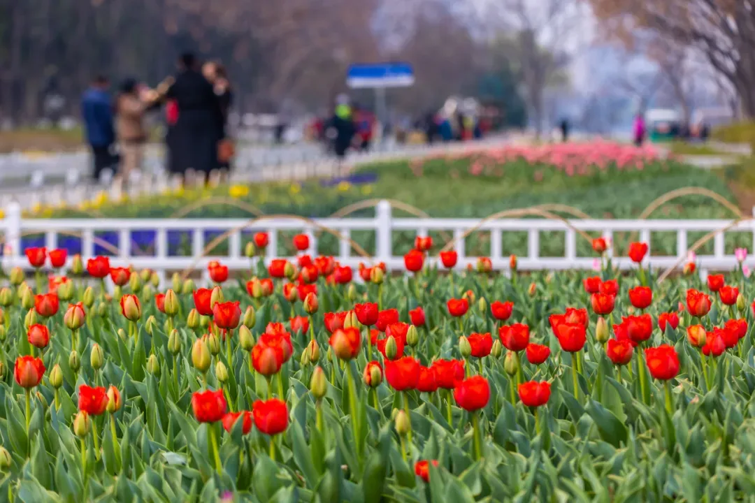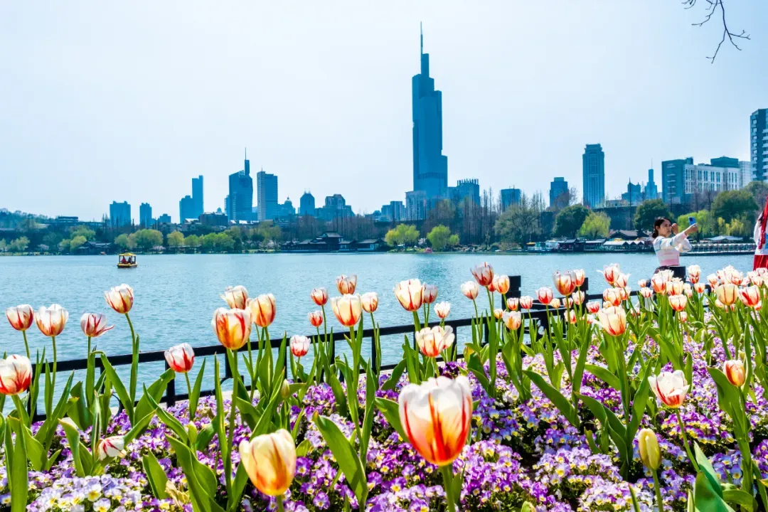 作为中国第一座国立植物园,中山植物园珍藏着腊叶标本70余万份,植物园保存植物3000种以上,是座名副其实的“花花世界”。3月中旬至4月中旬,正是园内郁金香娇艳的好时机,成片的郁金香迎风招展,见过郁金香「发光」的人,才懂得起风的浪漫。春风十里,不如花海一片!每年三月,玄武湖公园便化身为一座巨大的“春日花园”,美得让人挪不开眼!眼下,玄武湖公园里的情侣园更是因郁金香的盛开,成为了园内热门打卡地。情侣园花卉大道的郁金香,是春天最热烈的色彩。红色、黄色、粉色、紫色……一朵朵郁金香整齐地排列在花田中,宛如一幅巨大的油画。阳光洒下,花瓣上的露珠闪烁着微光,仿佛每一朵花都在向你诉说着春天的故事。说起玄武湖郁金香的最佳观赏区域,情侣园花卉大道、访花蝶径等区域,都早已是大家熟知的观赏点。而除这两个地方外,在玄武门翠虹堤区域也有一片“低调”的郁金香打卡点。此区域的郁金香不仅可以与紫峰大厦、明城墙同框,更是可以泛舟湖上,开启一场水上赏花之旅。