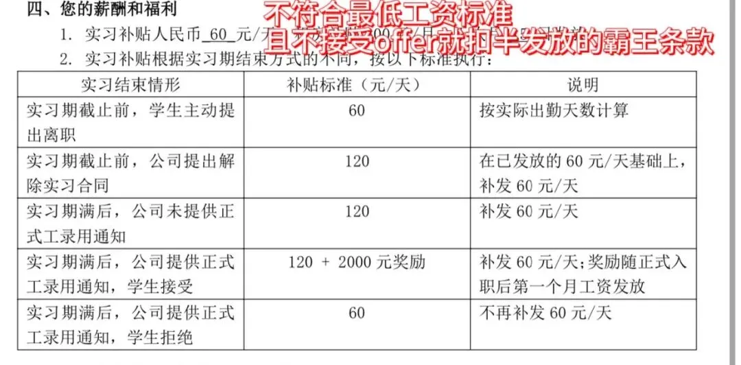结果在发Offer的时候说实习结束之前只有一半的工资,也就是60块钱每天,不符合南京最低工资标准,而且居然还有不接受Offer也是减半发放的霸王条款。