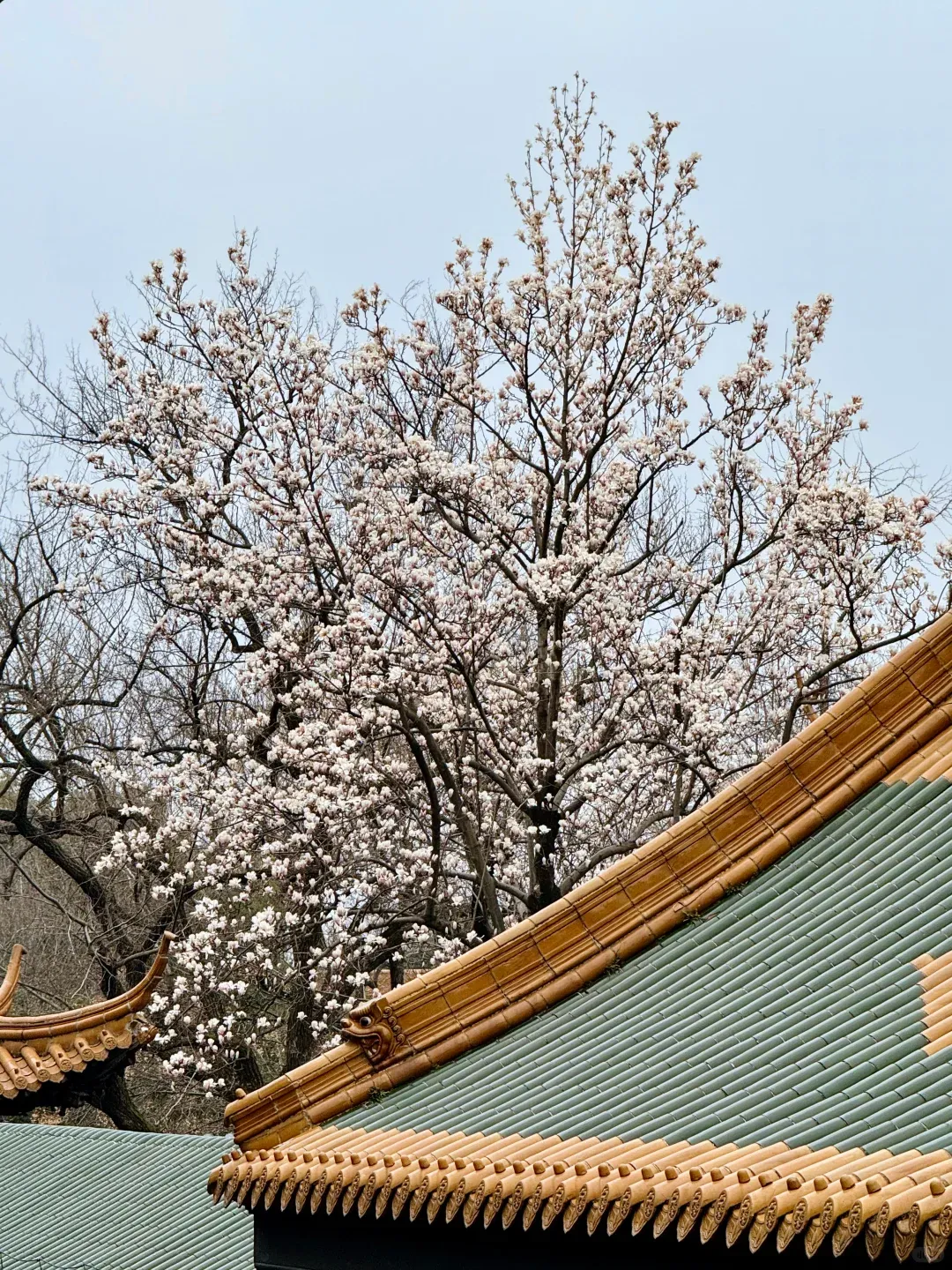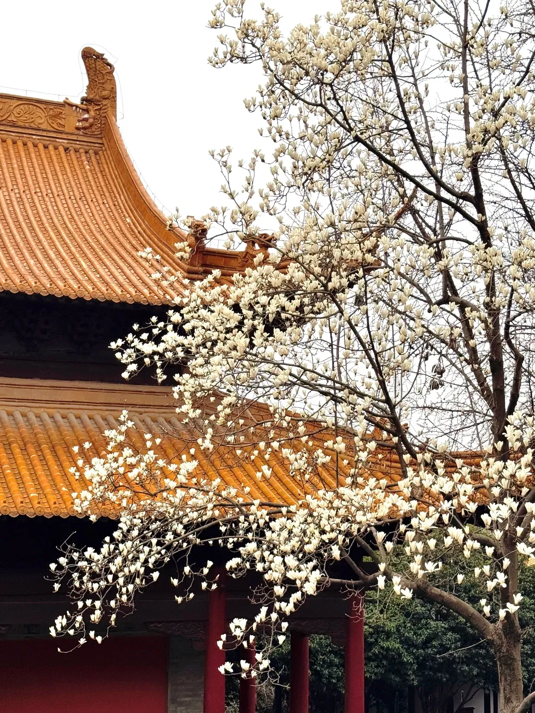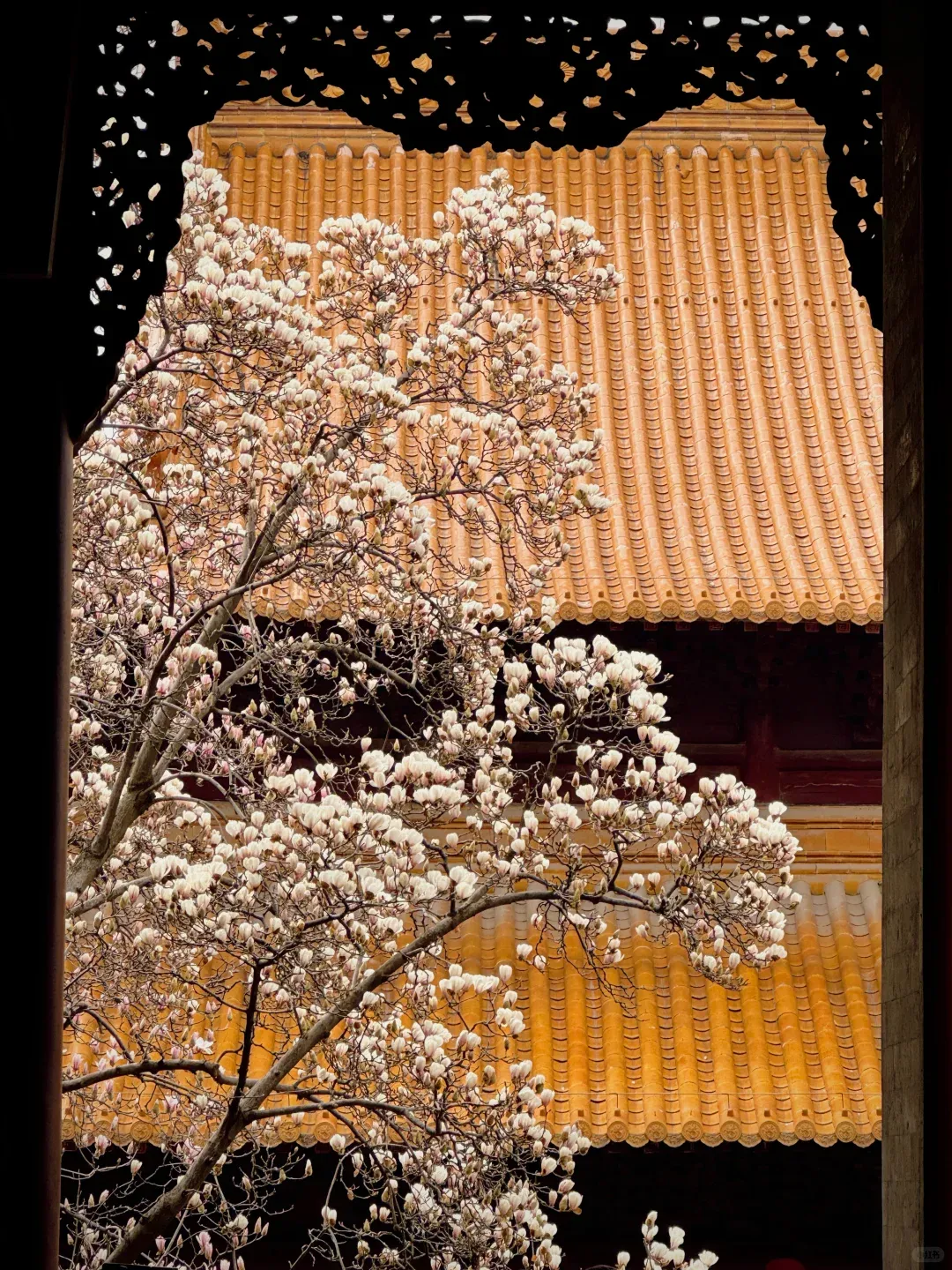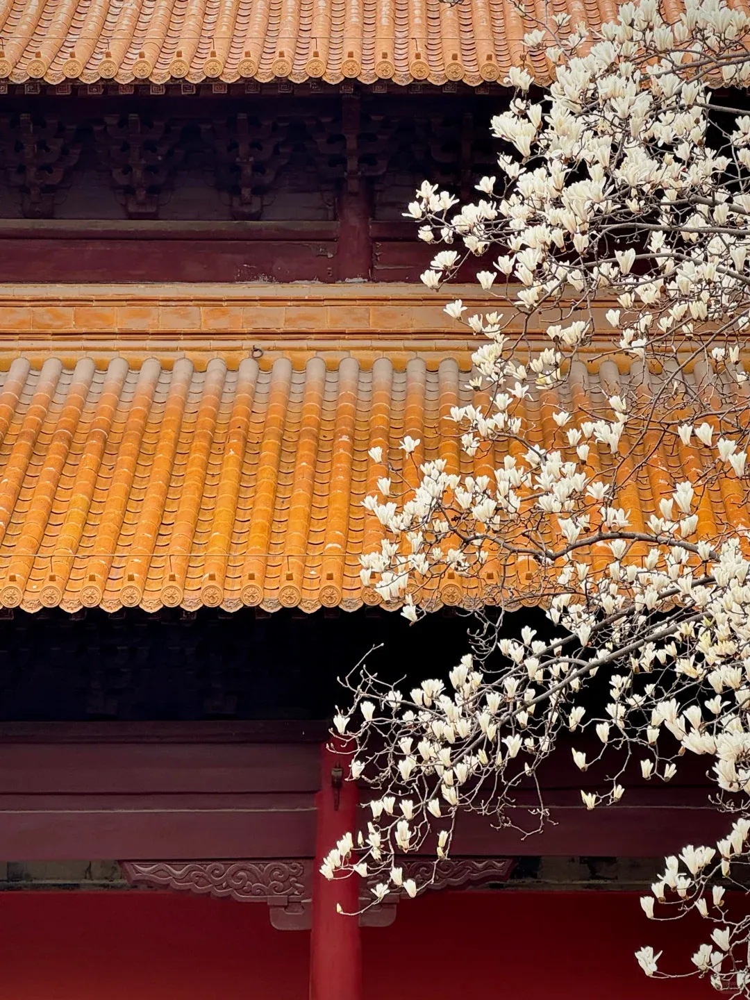朱红宫墙厚重典雅,鎏金飞檐精致灵动,莹白玉兰斜倚其间,一红一黄一白,色彩层次分明,既有历史的厚重感,又有春日的鲜活感。