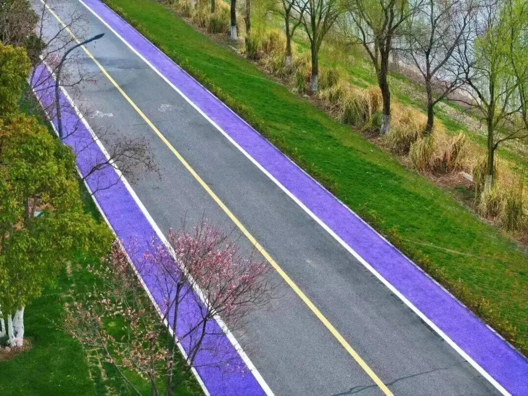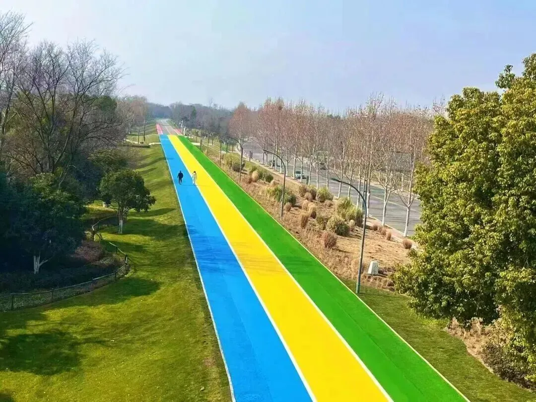 赤、橙、黄、绿、青、蓝、紫,七种色彩,每种颜色路段约3公里,加上最后一段1.4公里的粉色路段,22.4公里的“七彩跑道”,成为美不胜收的七彩长卷。