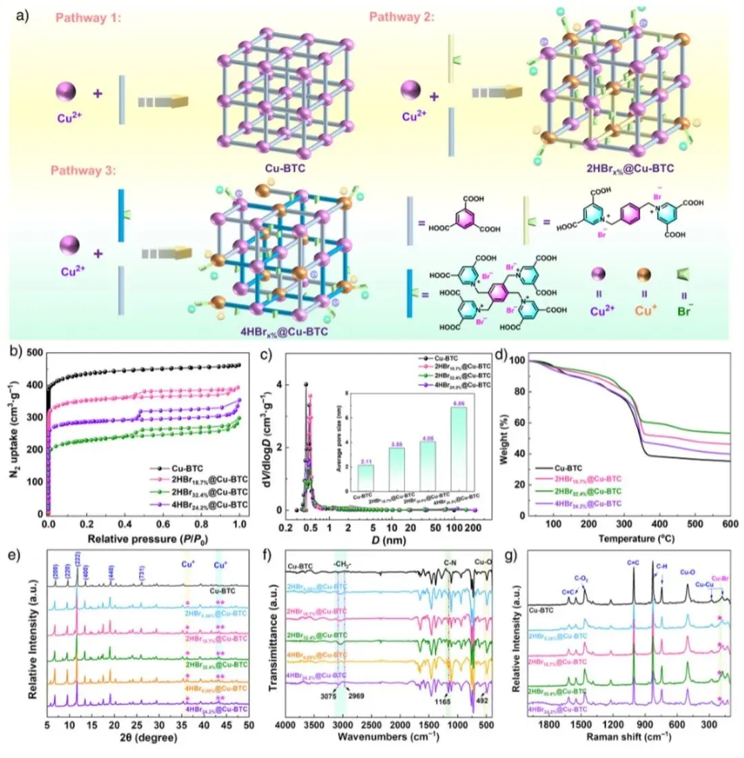图1 a) Cu-BTC和iMOFs的合成方案;b) Cu-BTC和iMOFs的氮气吸附-脱附等温线;c) 基于非局部密度泛函理论(NLDFT)方法得出的孔径分布;d) Cu-BTC和iMOFs的热重分析(TGA)曲线;e) Cu-BTC和iMOFs的X射线衍射图谱(*表示Cu⁺的特征衍射峰);f) Cu-BTC和iMOFs的傅里叶变换红外光谱(FTIR)谱;g) Cu-BTC和iMOFs的拉曼光谱。
