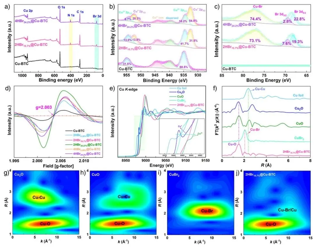 图2 a) Cu-BTC和iMOFs的全X射线光电子能谱(XPS)扫描谱;b) Cu-BTC和iMOFs的铜2p XPS谱;c) Cu-BTC和iMOFs的溴3d XPS谱;d) 室温下Cu-BTC和iMOF中氧空位的电子顺磁共振(EPR)谱;e) 2HBr18.7%@Cu-BTC和参考样品的铜K边X射线吸收近边结构(XANES)谱;f) 2HBr18.7%@Cu-BTC和参考样品的傅里叶变换k²加权铜K边扩展X射线吸收精细结构(EXAFS)谱;g) - j) 铜箔、氧化亚铜、氧化铜、溴化铜和2HBr18.7%@Cu-BTC的小波变换(WT)等高线图。