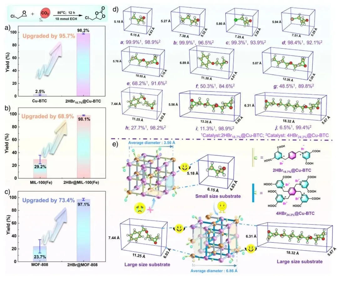 图4 a) 常压下2HBr18.7%@Cu-BTC的催化性能评估,催化剂用量:100 mg;b) 2HBr@MIL-100(Fe)的催化性能评估,催化剂用量:100 mg;c) 2HBr@MOF-808的催化性能评估,催化剂用量:100 mg;d) iMOFs在不同分子尺寸环氧化物环加成反应中的催化性能。反应条件:10 mmol环氧化物,0.07 mmol Br⁻,80 °C,12 h,0.1 MPa二氧化碳;e) 针对不同分子尺寸底物合理选择2HBr18.7%@Cu-BTC和4HBr24.2%@Cu-BTC的示意图。