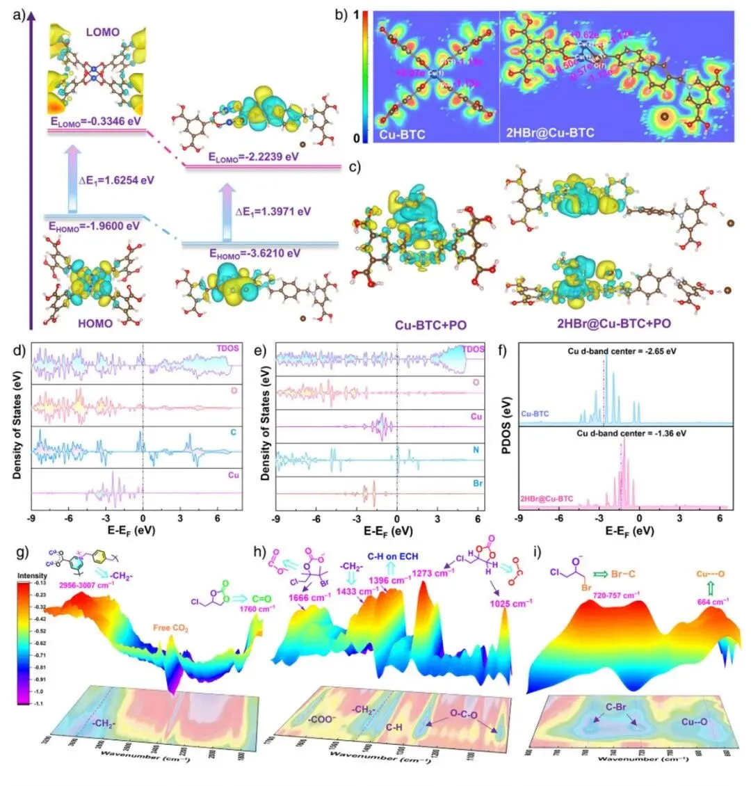 图5 a) Cu-BTC和2HBr@Cu-BTC的最高占据分子轨道(HOMO)和最低未占据分子轨道(LUMO)分布,展示了空间电荷分离路径;b) 电子局域函数(ELF)图及Bader电荷分析(ELF值范围为0到1,其中1表示完全电子局域化,0表示完全电子离域化);c) PO在Cu-BTC和2HBr@Cu-BTC上吸附的差分电荷密度图,黄色区域表示电荷积累,蓝色区域表示电荷耗尽;d)、e) 分别为Cu-BTC和2HBr@Cu-BTC的总态密度(DOS)和分波态密度(PDOS);f) Cu-BTC和2HBr@Cu-BTC中铜d轨道的投影态密度(PDOS),d带中心用短实线标记;g) - i) 2HBr18.7%@Cu-BTC上二氧化碳和环氧氯丙烷吸附及反应的原位漫反射红外傅里叶变换光谱(DRIFTS)研究。