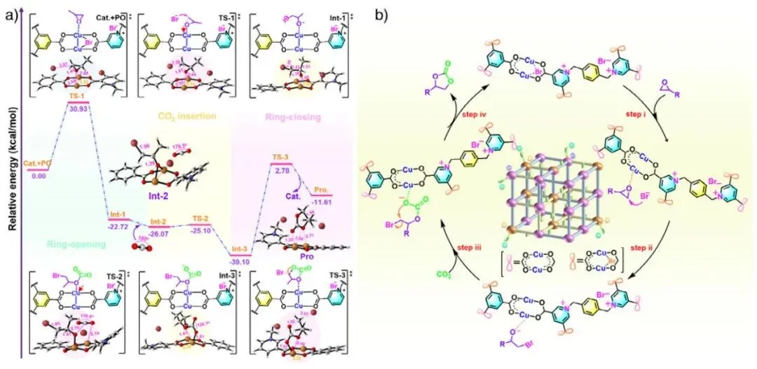 图6 a) 2HBr@Cu-BTC催化剂模型的计算最小能量路径,其中碳为灰色、氢为浅灰色、溴为棕红色、氮为蓝色、氧为红色、铜为黄棕色。b) 二氧化碳环加成反应的提议反应机理。