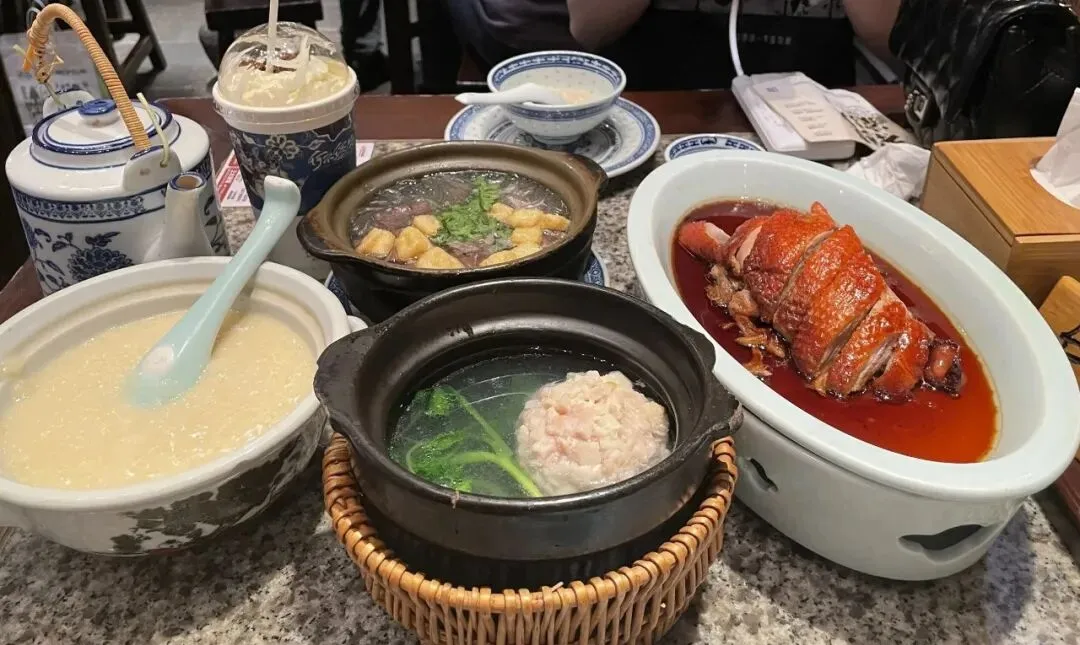 鸭血粉丝汤端上来,热气腾腾的。汤是清的,粉丝软硬刚好,鸭血嫩滑,鸭肠脆爽。烧鸭皮脆肉嫩,蘸着甜面酱吃,满口香。美龄粥是甜的,糯米熬得烂烂的,里面加了百合和山药,据说当年宋美龄最爱喝这个。狮子头很大一个,肉剁得细,入口即化。物价合理,量也足,好吃没踩雷。