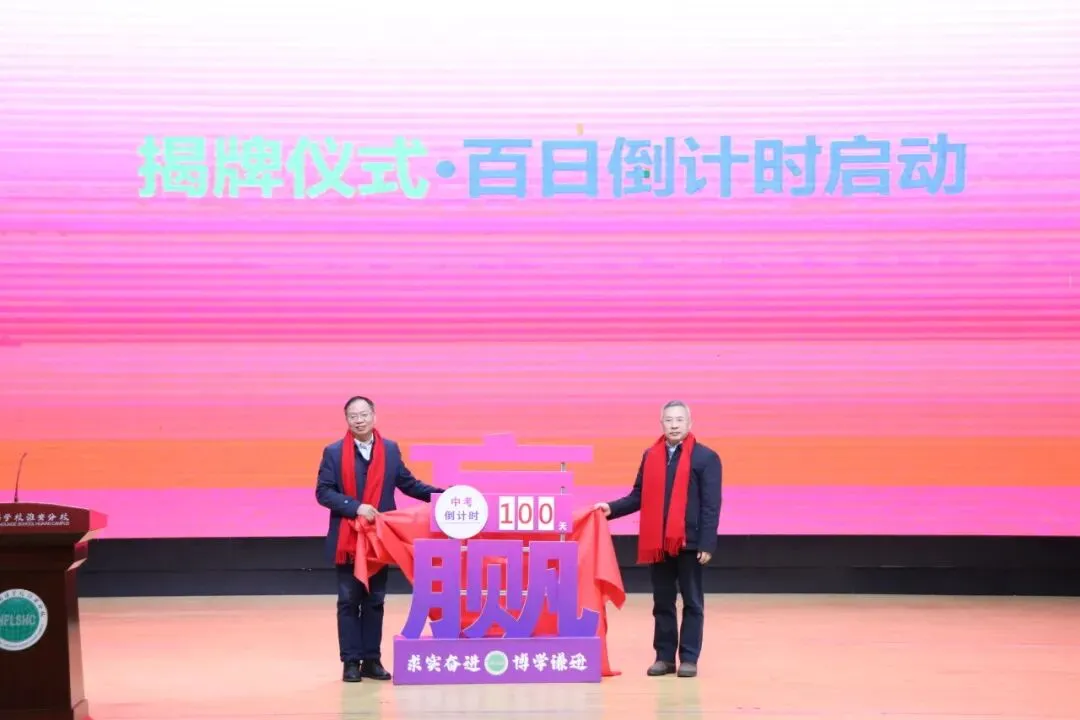 最激动人心的 “倒计时” 揭牌仪式上,蔡才福校长与曹志兵副校长共同为中考倒计时牌揭牌。倒计时牌上的“赢”字格外醒目,它不仅是中考的目标,更是奋斗的坐标,提醒着每一位学子:冲刺的号角已经吹响,决战的时刻已然来临。
