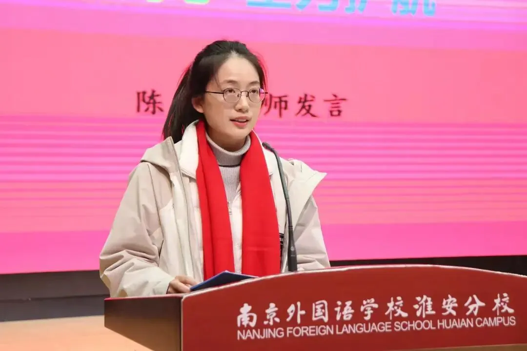 初三教师代表陈月华老师上台发言,她以 “龙马精神启新程,百日逐梦向未来” 为题发言。她结合丙午马年龙马精神,以冬奥会健儿坚守拼搏的事迹激励学子,将中考比作青春赛场。同时立足 AI 时代,指出备考不止于学习知识,更在于锤炼思考、坚韧等不可替代的品格。她号召同学们以坚定决心与耐心全力冲刺,祝愿全体初三学子百日磨砺,马到成功。
