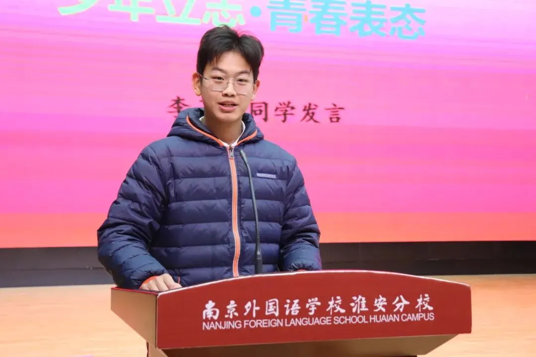 大会由安素岩、胡茹涵两位同学主持。在庄严的升旗仪式后,全体师生肃立,齐唱国歌,行注目礼,嘹亮的歌声响彻会场,彰显着南外淮安分校学子的青春担当。