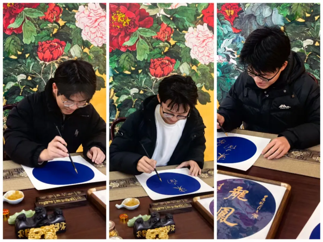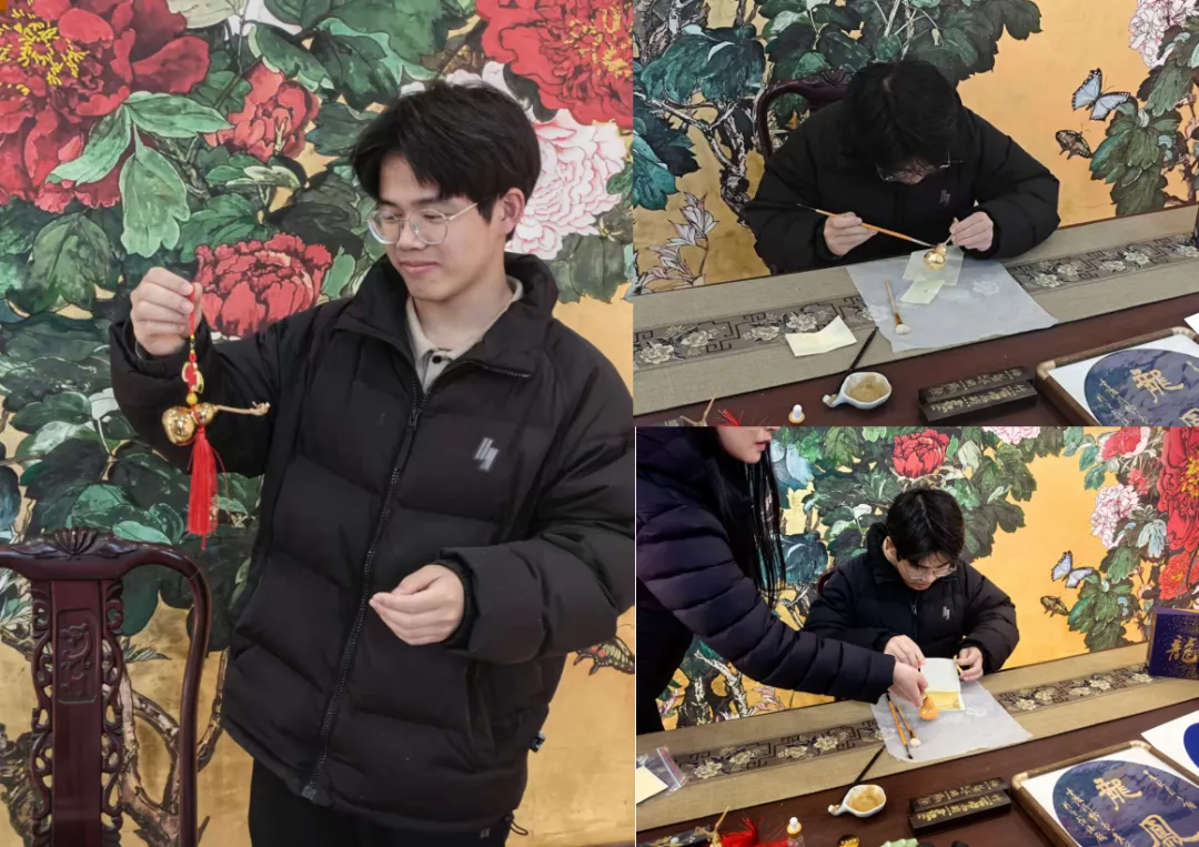 团队成员也在这里亲身体验了与金箔有关的多项工艺制作:团队成员用金粉体验书法——“东南大学——南京金箔”金色大字在纸上熠熠生辉;与此同时,团队成员亲身体验“贴金箔”这道工艺,最后完成“金葫芦”工艺品。