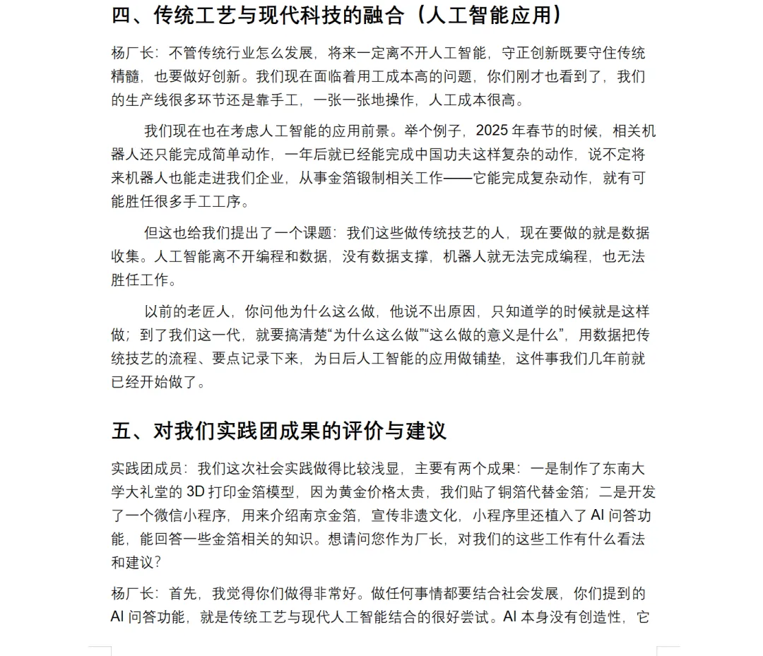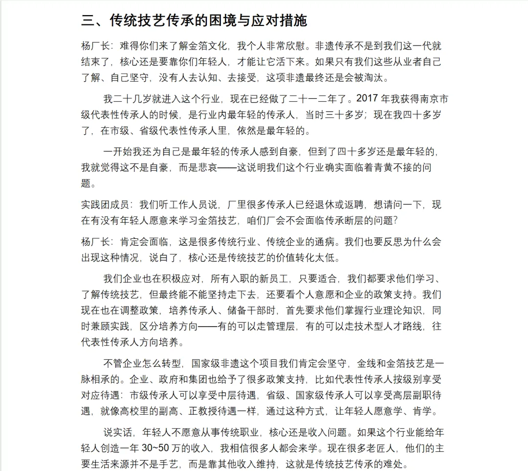 通过对通过对省级非遗传承人杨厂长的采访,实践团成员了解到金箔行业面临传承青黄不接的困境,为了解决这个问题,企业积极借助政策支持培养传承人。同时,企业也正探索人工智能应用,用数据记录传统技艺流程要点。杨厂长肯定我们的实践成果,建议我们注重品牌,挖掘AI与金箔文化结合点助力传播。