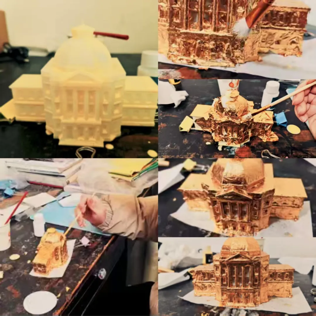 实践团成员将金箔与东大元素结合,将东大的标志性建筑大礼堂建模进行3D打印,并根据在金箔厂观摩学习到的技艺亲手创造鎏光溢彩的大礼堂。