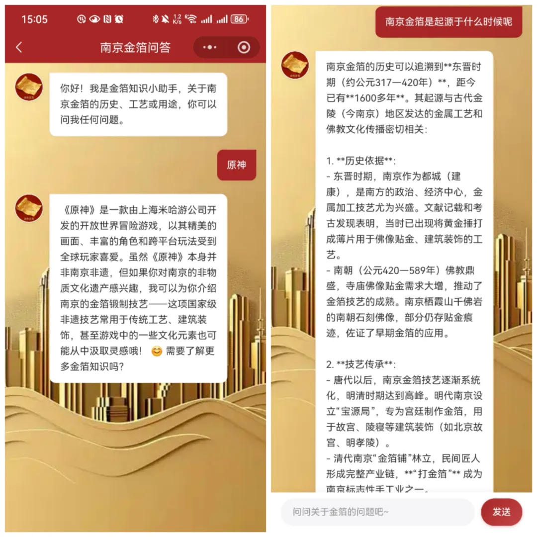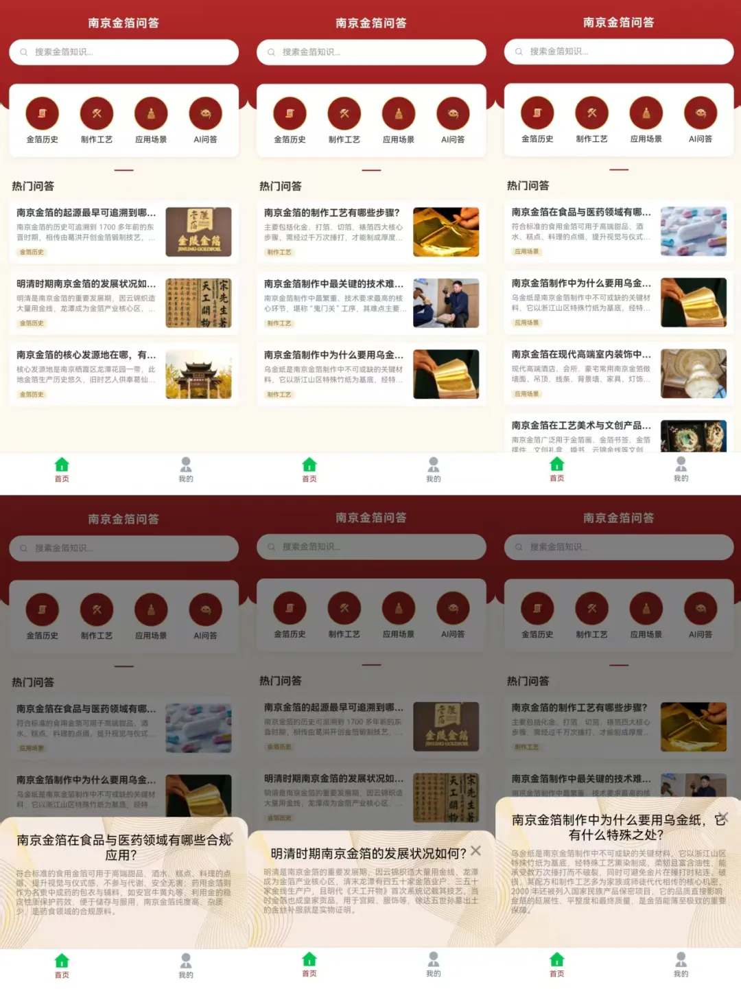 为了让人们更方便的了解金箔相关的知识,实践团成员制作了探秘金箔小程序。小程序具有金箔知识介绍、金箔知识问答等功能,同时也接入了DeepSeekV3大模型,能够更精确地对使用者的问题做出更准确的让使用者满意的回答。
