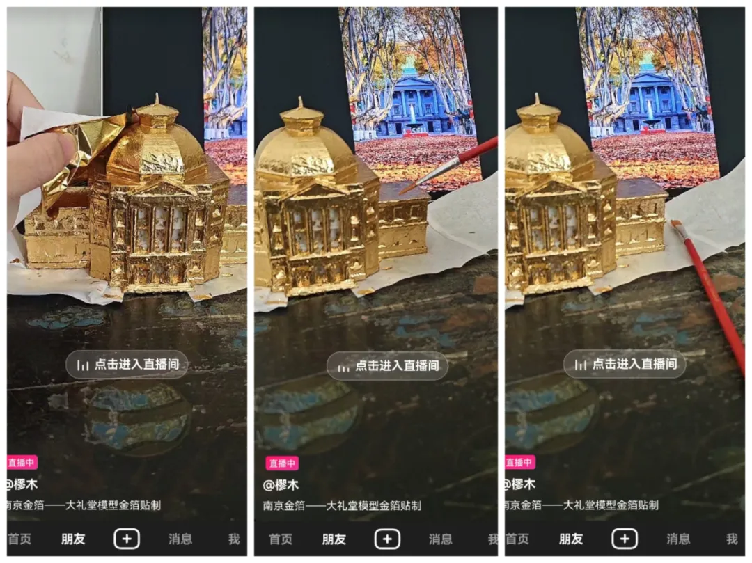 为了更好地弘扬南京金箔文化,实践团于近期借助新媒体平台,通过公众号推文宣传与抖音直播相结合的方式,开展了一场别开生面的金箔文化传播活动。在公众号推文中,团队以图文并茂的形式,生动展现了金箔从原材料选取到成品诞生的每一道精细工序;而在抖音直播里,团队更是将镜头聚焦于大礼堂金箔粘贴的现场,让观众能够直观地感受到金箔艺术的独特魅力与匠人们的精湛技艺。