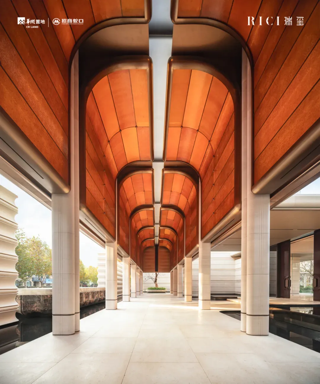 选用欧洲莱姆石、采用大板整切,辅以纯手工雕刻打磨的近百米恢弘小区大门;按照“拱形穹顶+镜面反射”的经典形制打造,长约30米高约8.8米的“光之穹顶”艺术长廊,尽显归家仪式感和身份尊崇感。