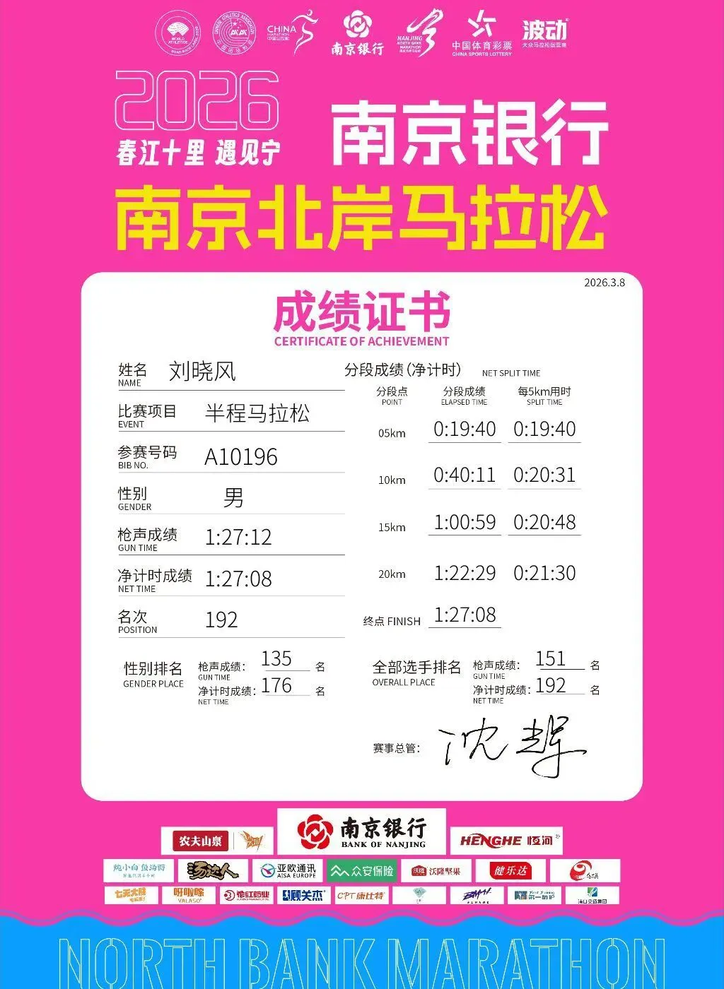 3月8日,2026南京北岸马拉松鸣,拉爆小队-晓风,身着橙色队服稳健发挥,以1小时27分08秒的成绩完成半程马拉松,顺利突破130目标,展现出扎实的训练功底与团队风采。