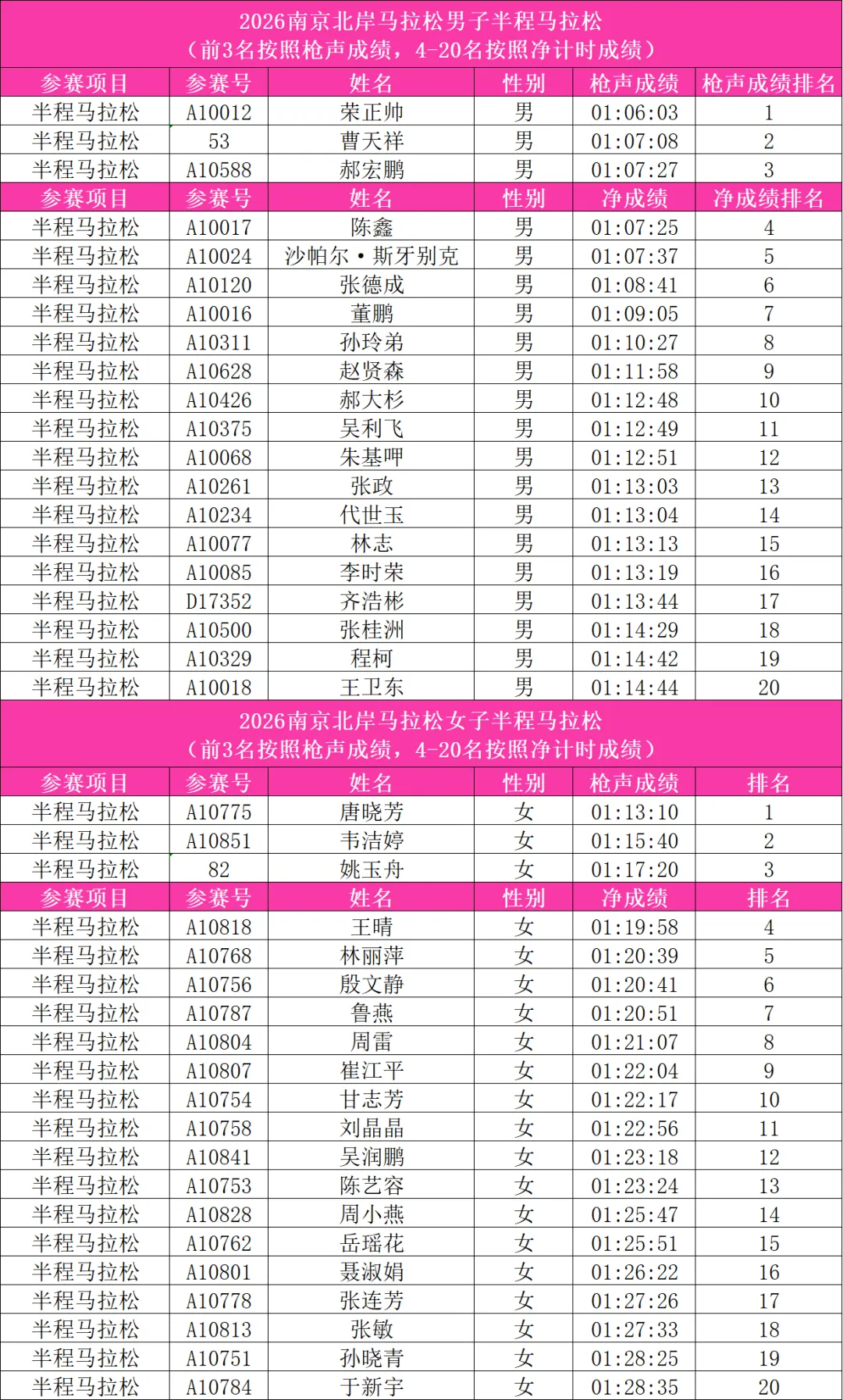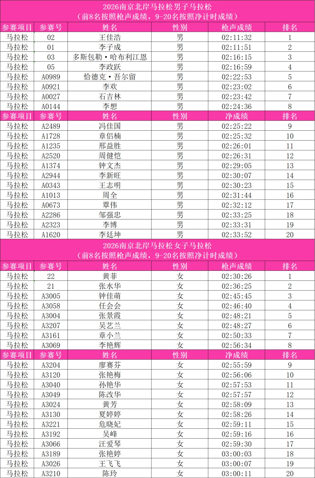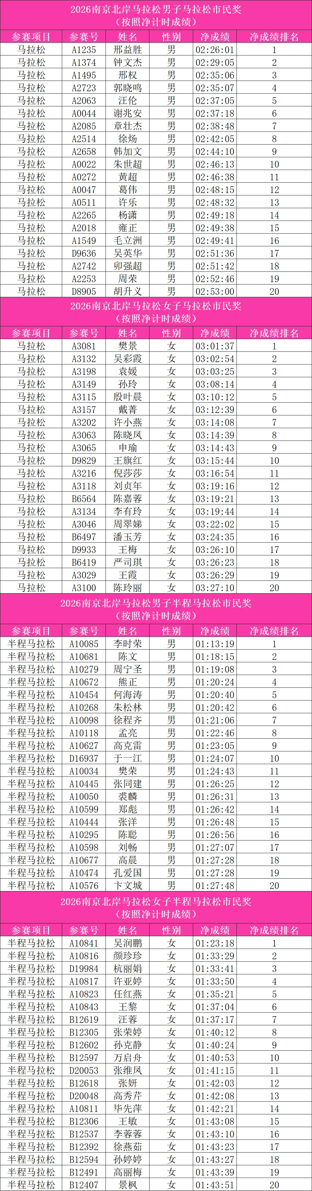 2026南京银行南京北岸马拉松圆满结束。现将马拉松、半程马拉松选手名次奖、南京籍选手市民奖获奖选手成绩予以公示,成绩公示为期10天。公示期内选手如对比赛成绩有异议,请联系南京北岸马拉松官方并提供真实有效的证据。